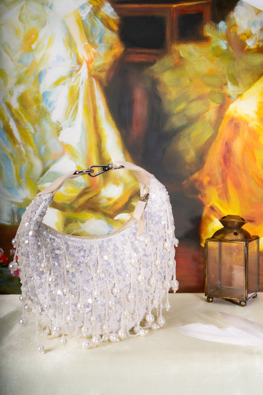 Sunset Tones, Statement EnergyWith its radiant amber hue and scalloped beaded fringe, this crescent-shaped clutch...