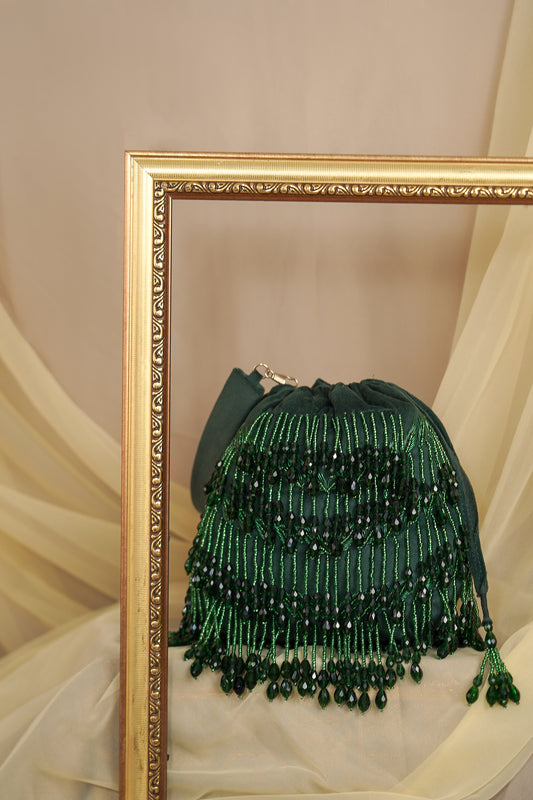 “A handcrafted emerald-green potli clutch, intricately embellished with shimmering beads and crystal teardrops. A statement...