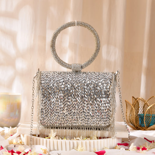 Where Craft Meets CelebrationThis White handheld bag is a radiant fusion of traditional craftsmanship and...
