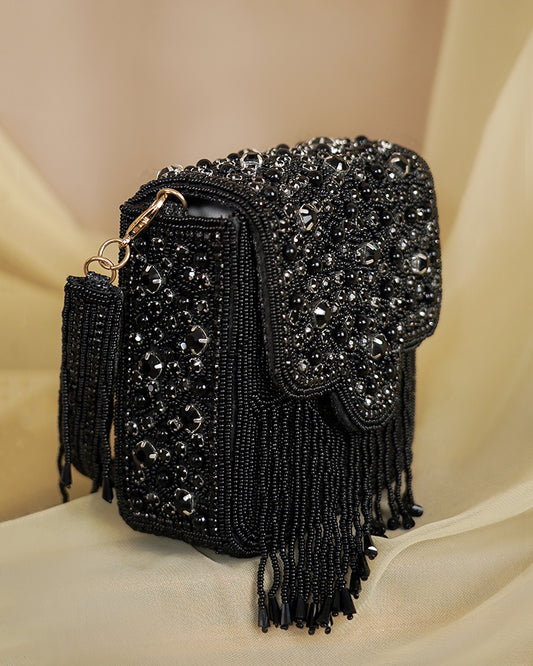 “An exquisite mini clutch adorned with lustrous pearls and glimmering crystals, finished with cascading bead...