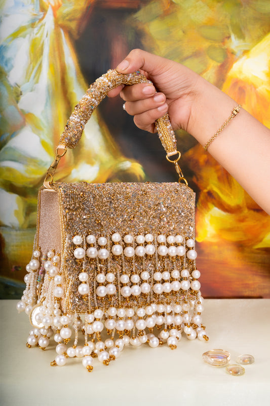 This clutch is a radiant medley of golden textures—handcrafted with intricate mother of pearl embellishment,...