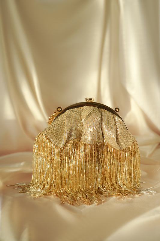 Old-School Glamour, Modern DramaWith its vintage kiss-lock closure and cascading gold silver fringe, this clutch...