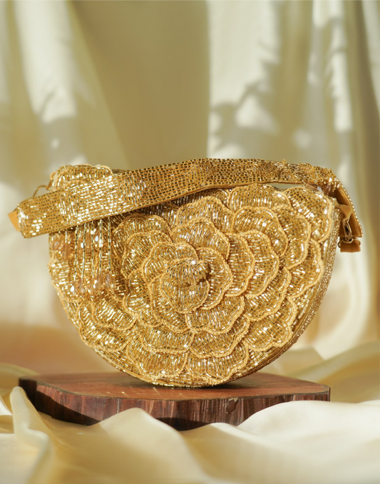 Elegance in Every Thread – This golden handcrafted clutch features intricate floral beadwork and a...