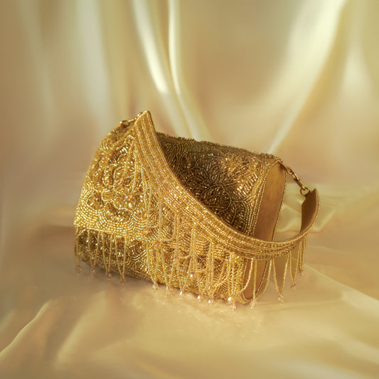 A "gold embroidered mini bag with sequin and tassels" would likely be a beautifully crafted...