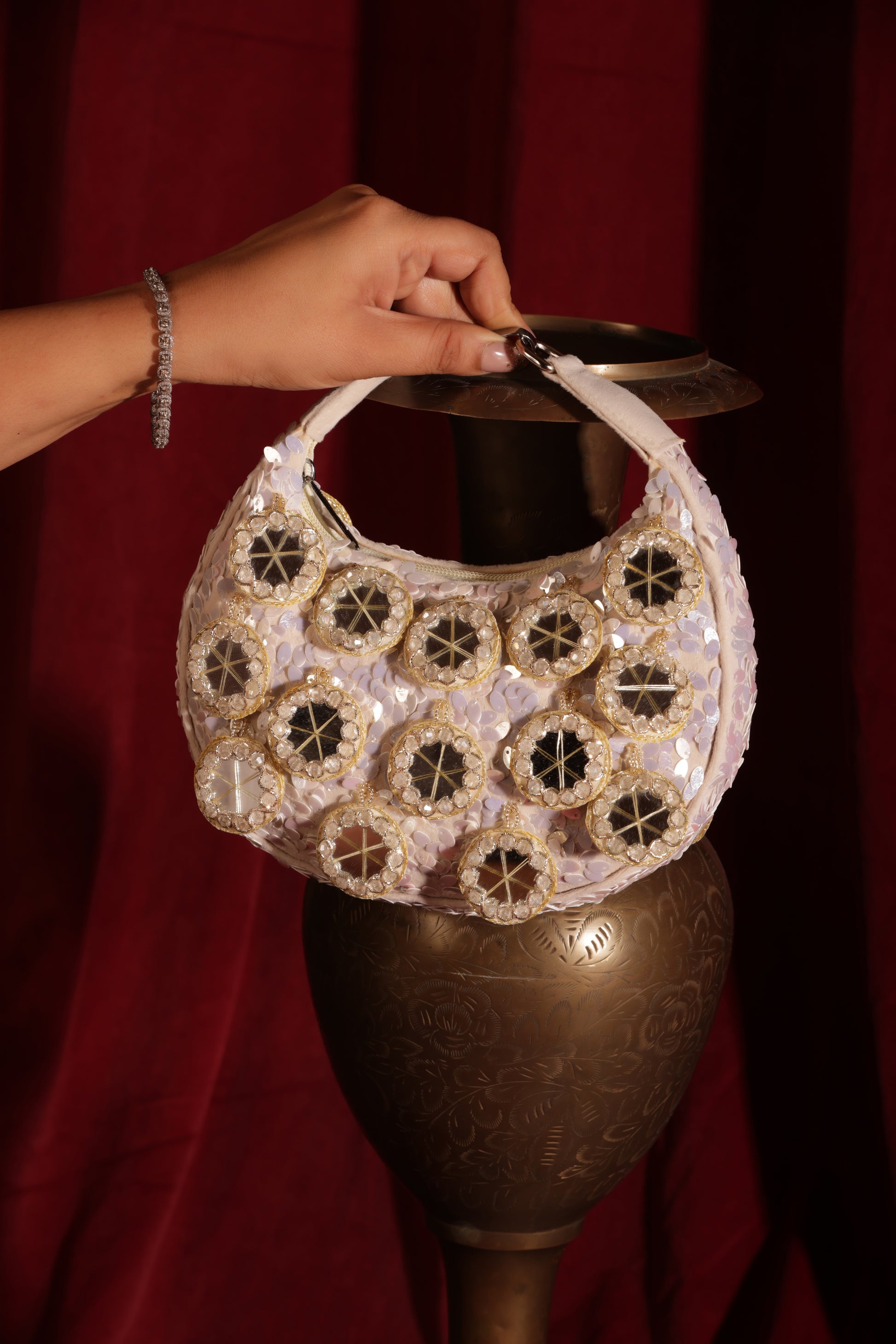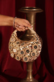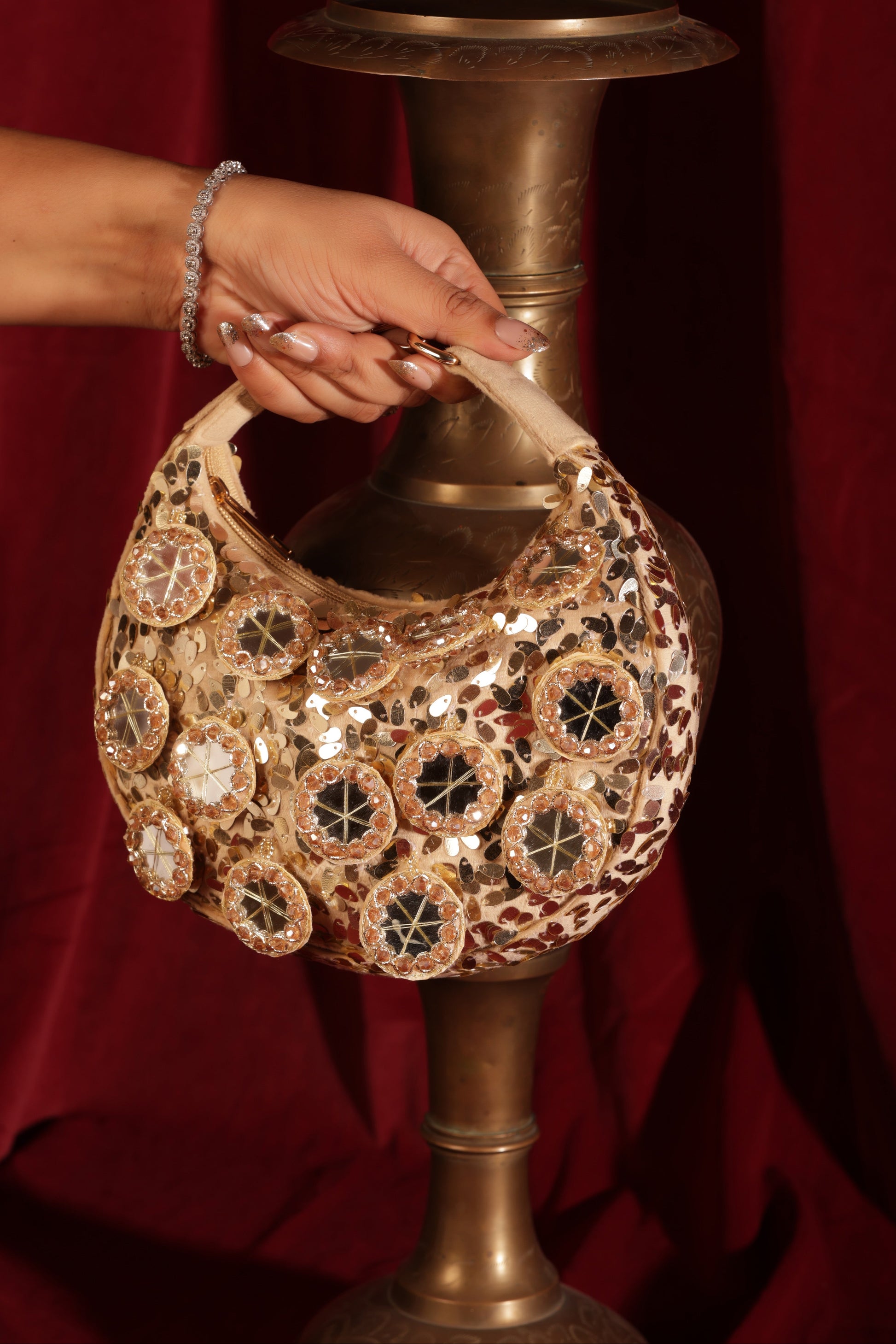 The Auric Moonlight Crescent Mirror Bag is a refined blend of tradition and subtle glamour. Handcrafted in a rich gold hue, it features minimal sequin detailing and delicate mirror work that adds just the right amount of shine without overpowering your outfit.
