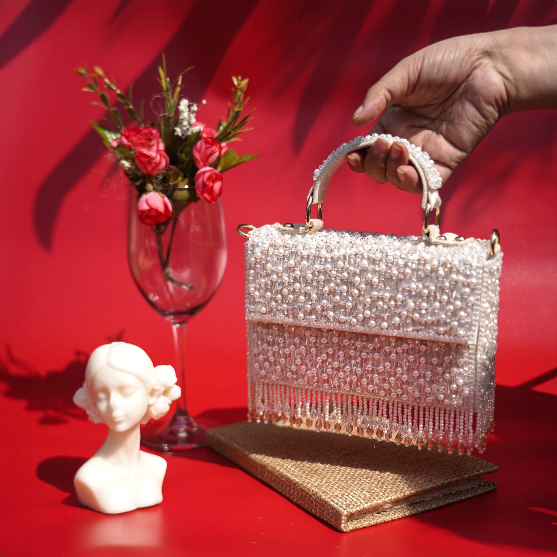 The Celeste Pearl Box Bag is a bold blend of classic pearls and modern flair. Adorned with lustrous faux pearls and a shimmering fringe, it’s a celebration of glamor—perfect for bridal showers, festive soirées, or a statement evening look.