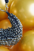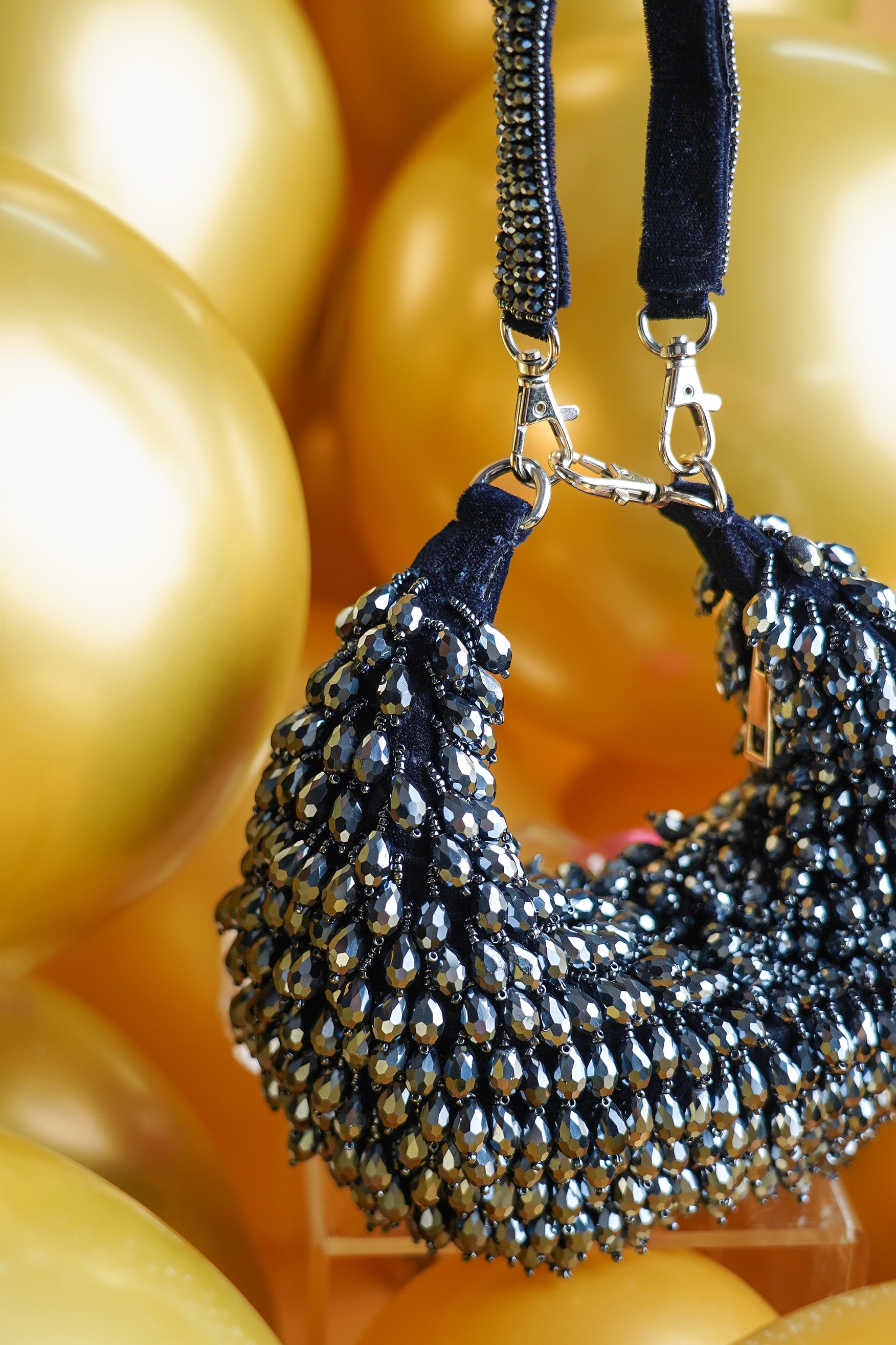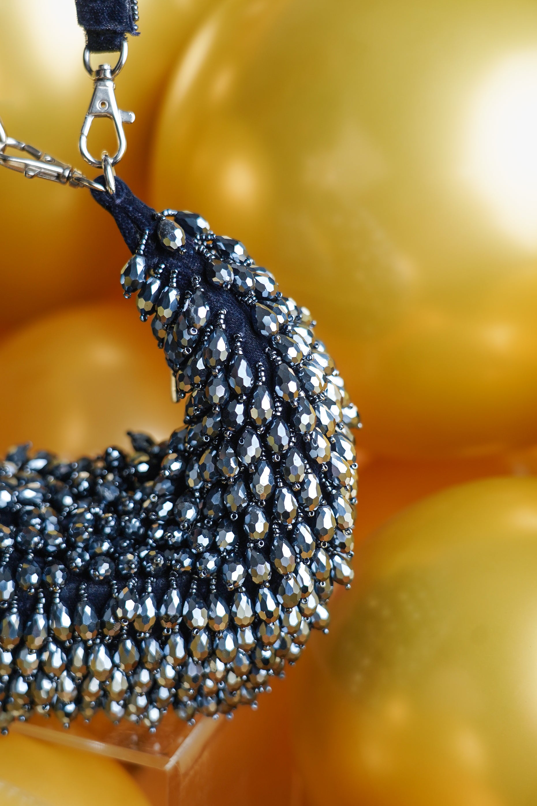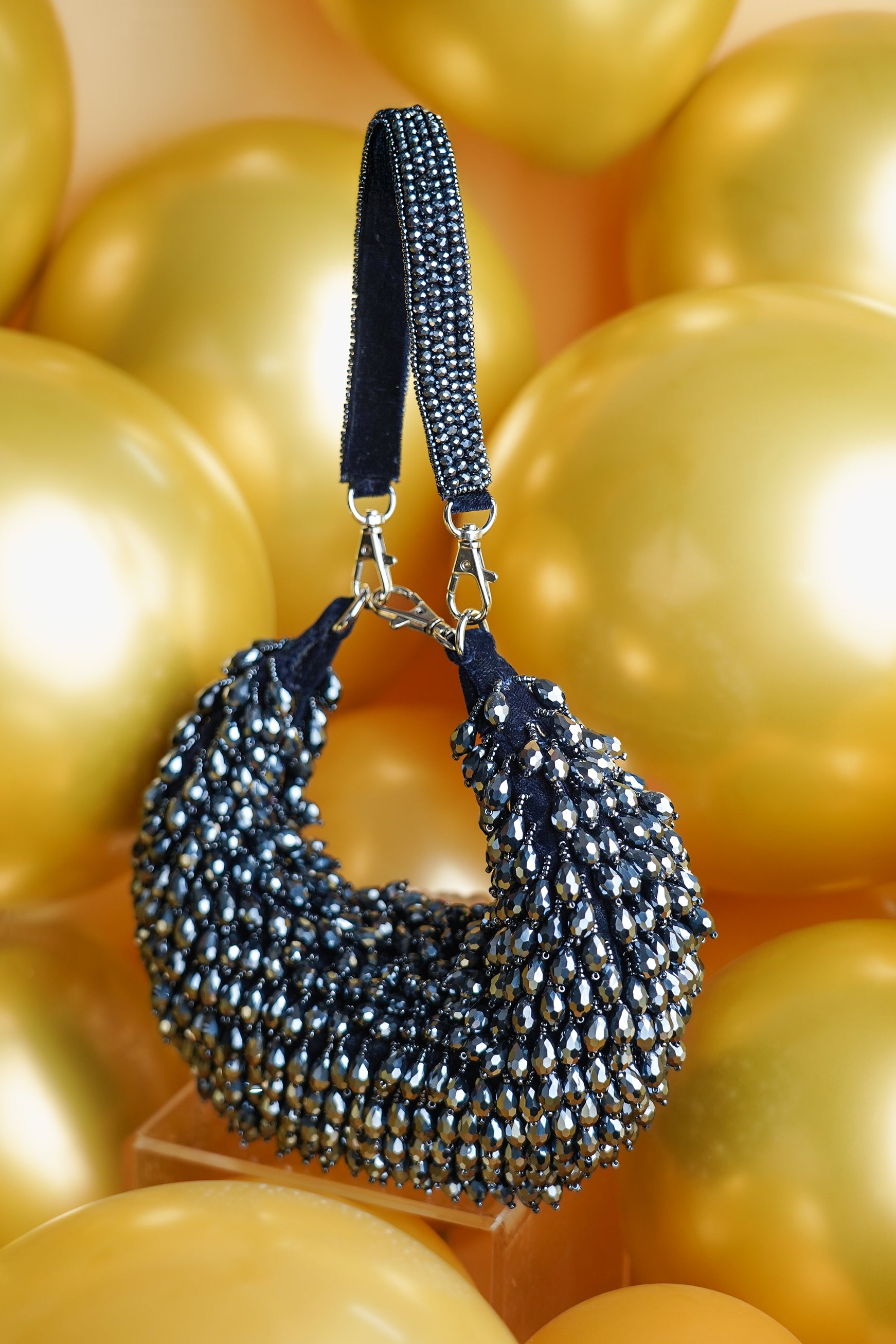 “A dazzling mini clutch adorned with black crystals, the Crystal Moon Clutch brings celestial glamour to any evening look. Compact yet captivating—perfect for nights that sparkle.”