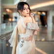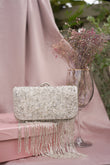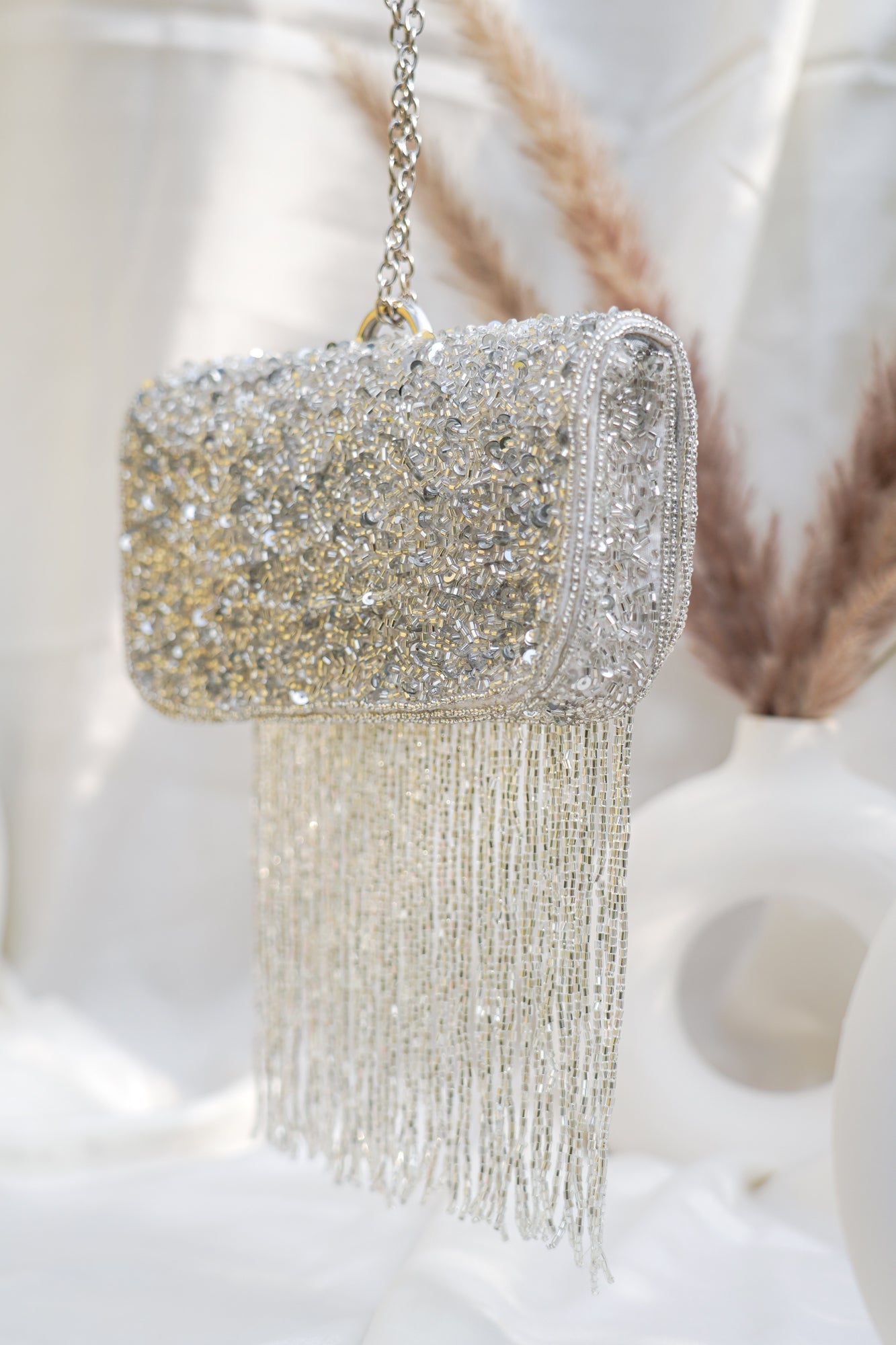 This silver crystal clutch brings red-carpet energy to your fingertips—hand-embellished with shimmering stones and finished with a dramatic fringe that moves like liquid light. Whether you're attending a sangeet, gala, or reception, this bag completes the look like a spotlight on your arm.