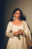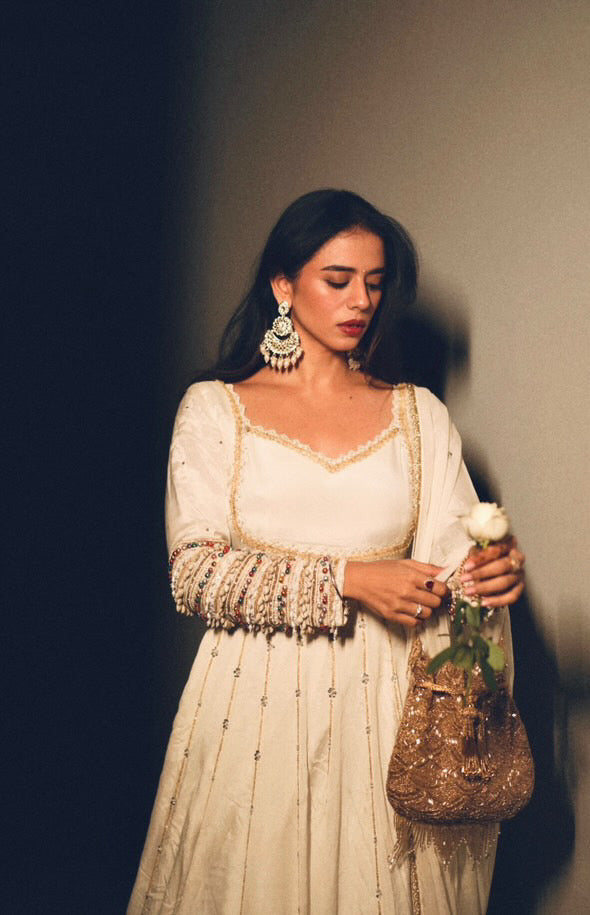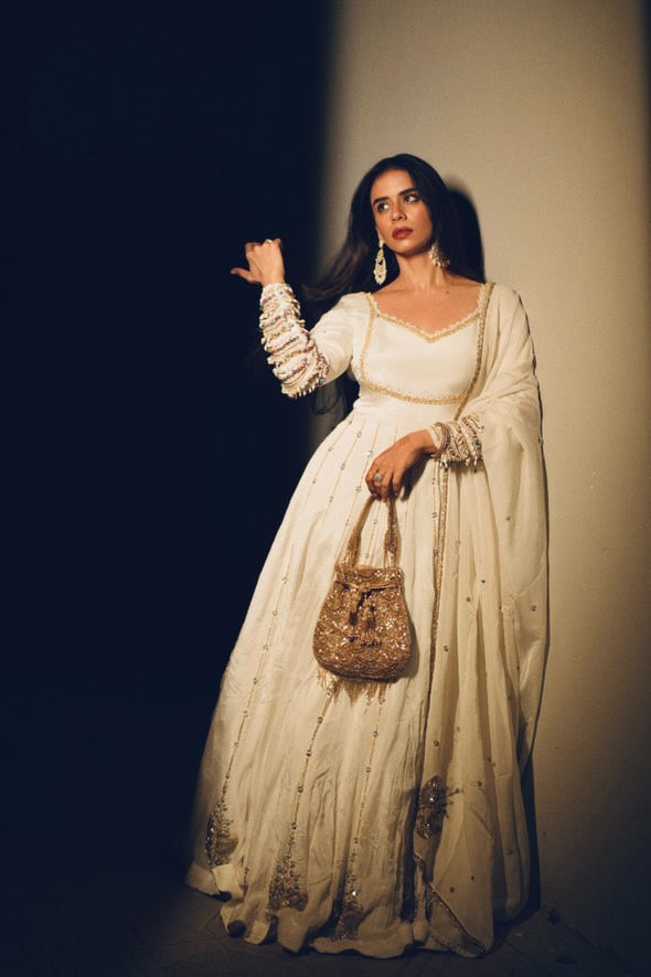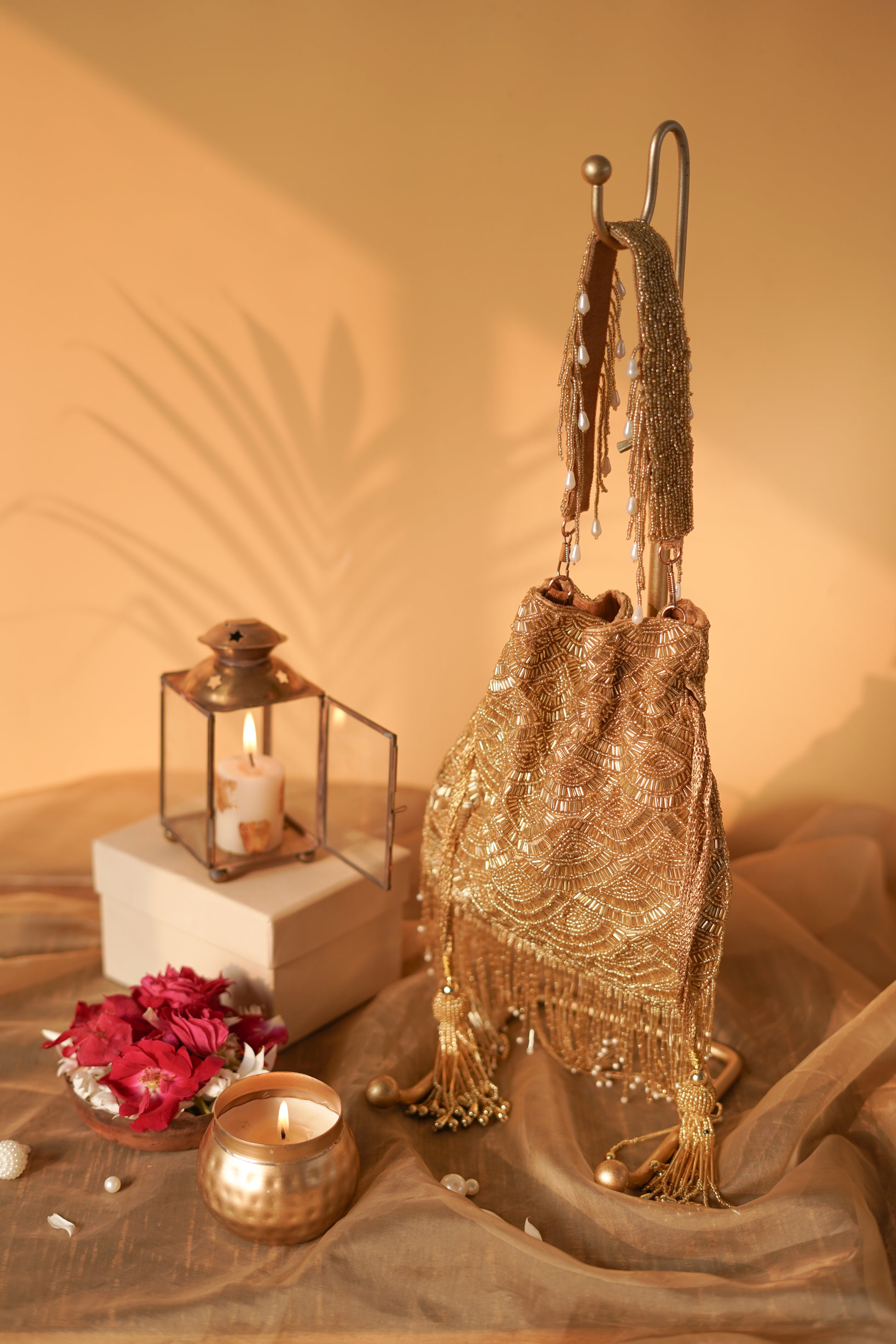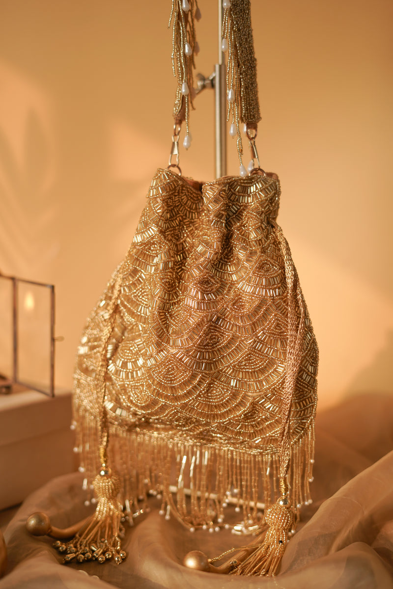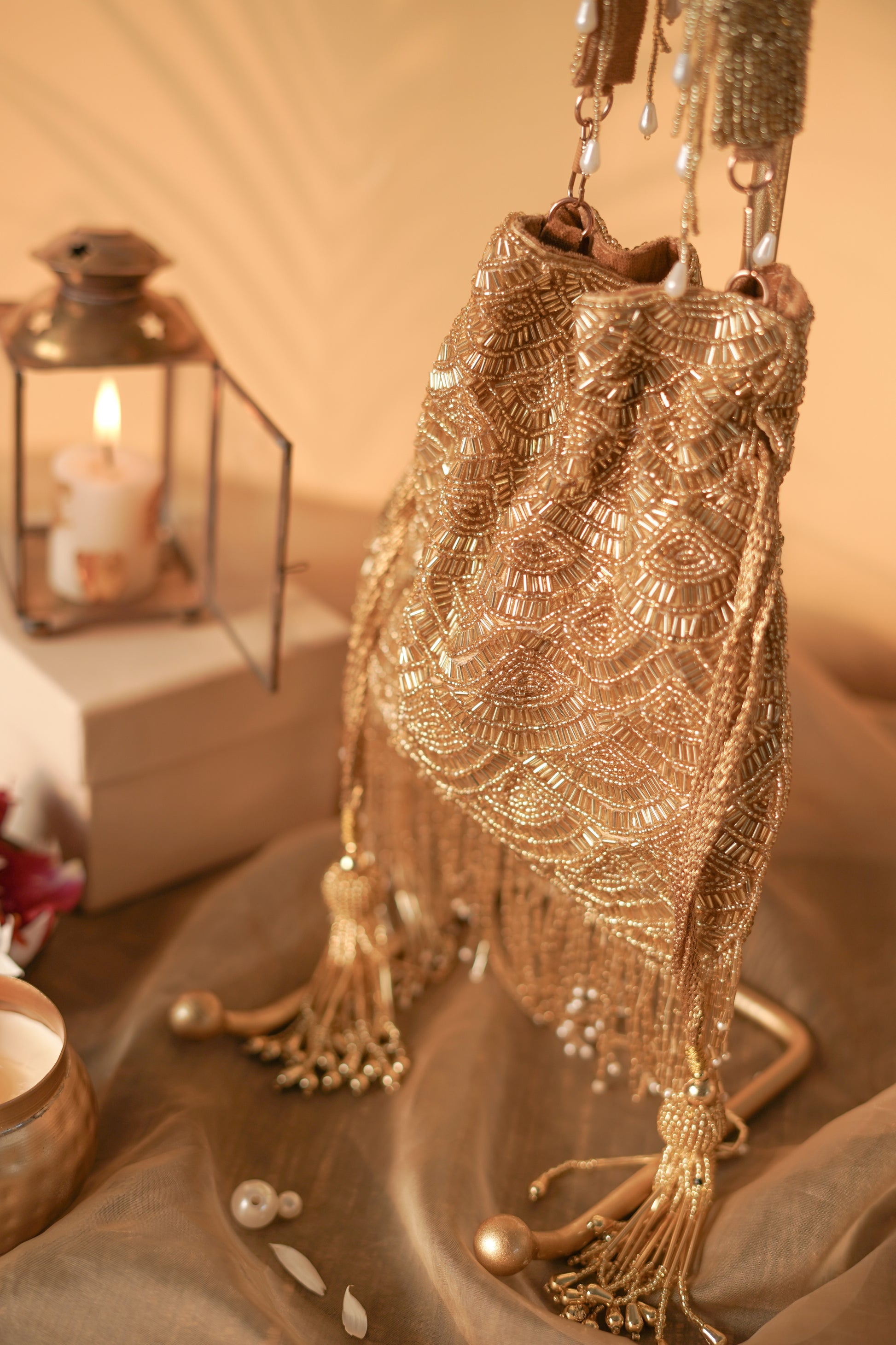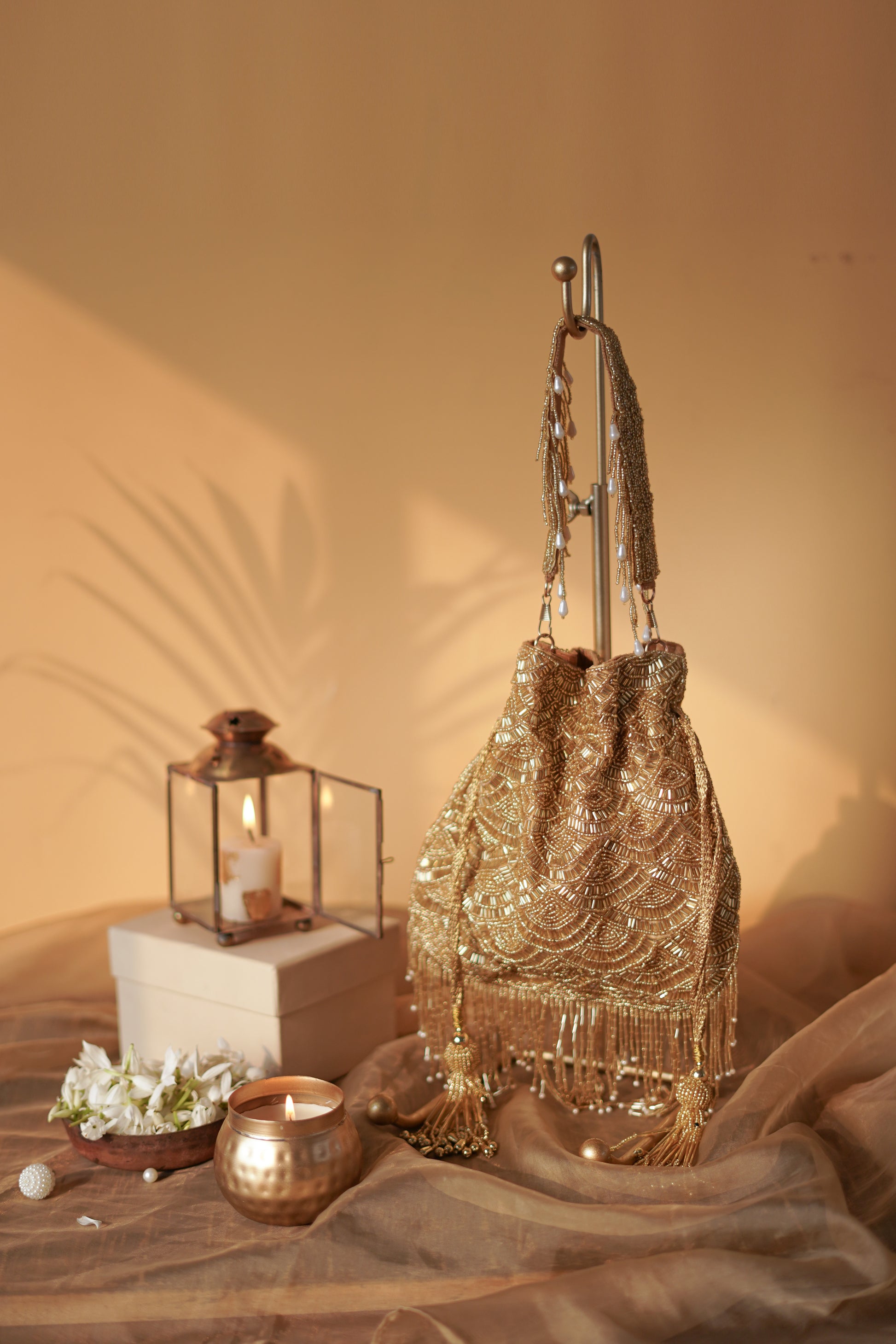 This luxurious gold potli is embellished with intricate zari embroidery, shimmering beads, and subtle fringe detailing—capturing regal charm with a contemporary twist. Styled here with an ivory ensemble, it’s perfect for wedding ceremonies, festive nights, or when your outfit calls for just the right touch of golden glam.