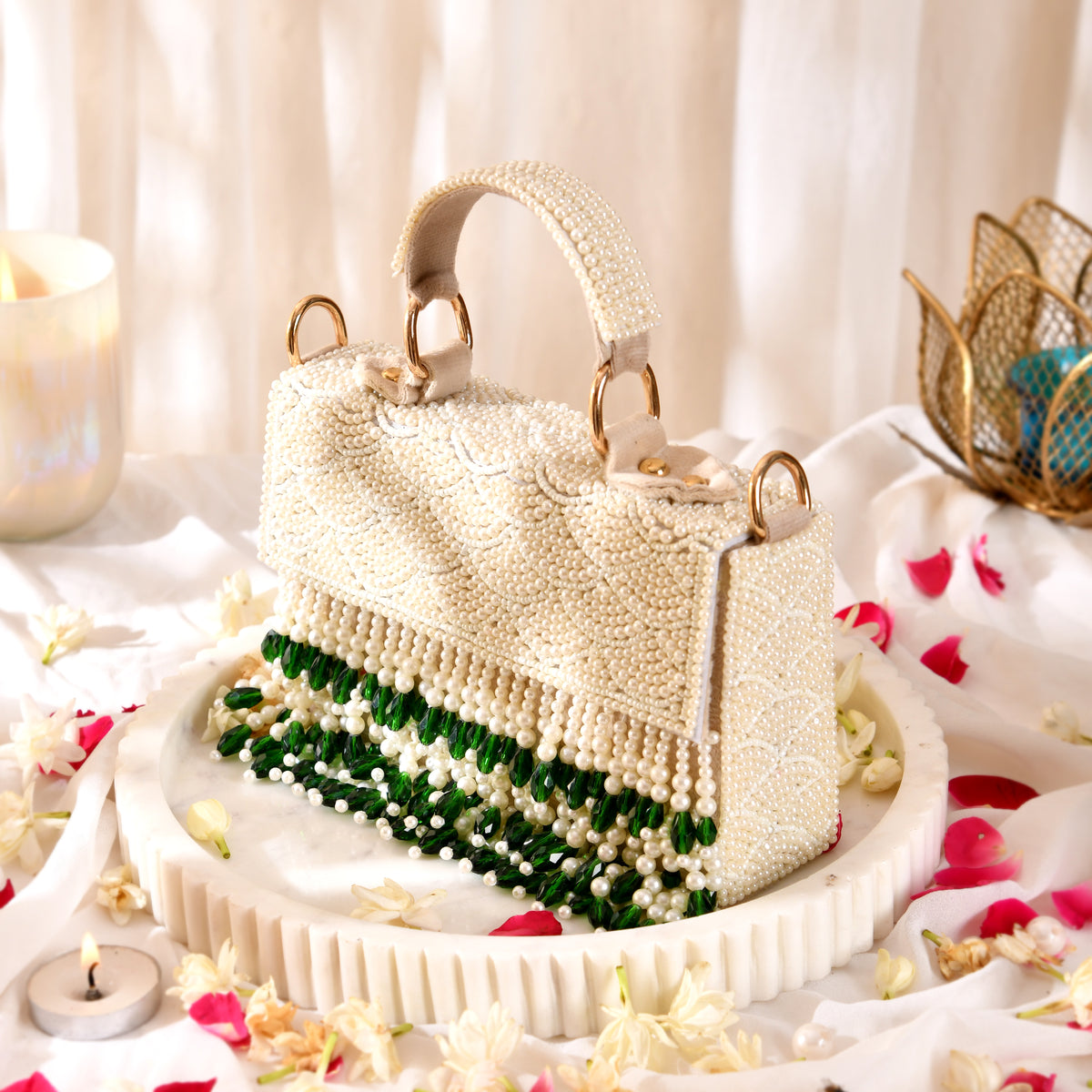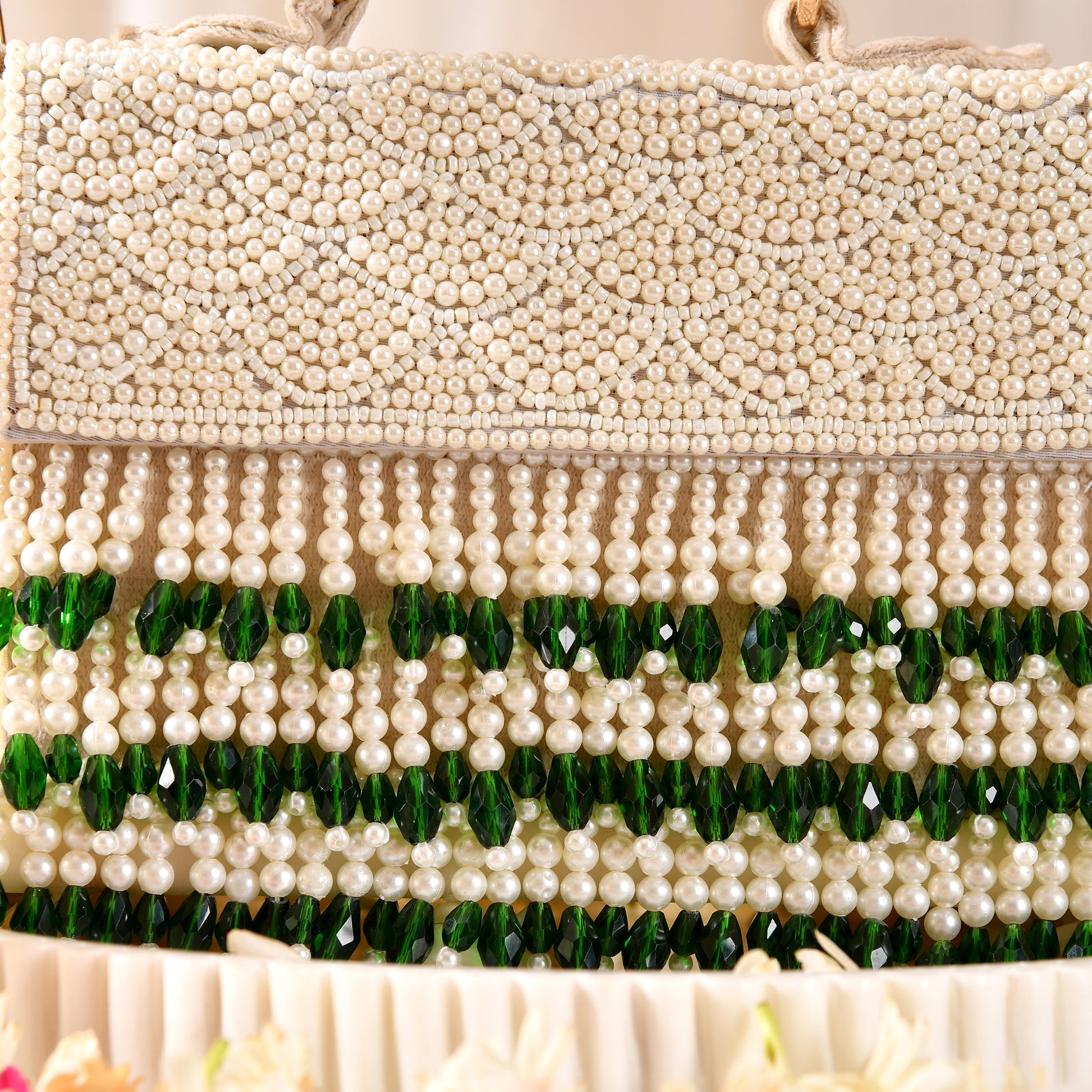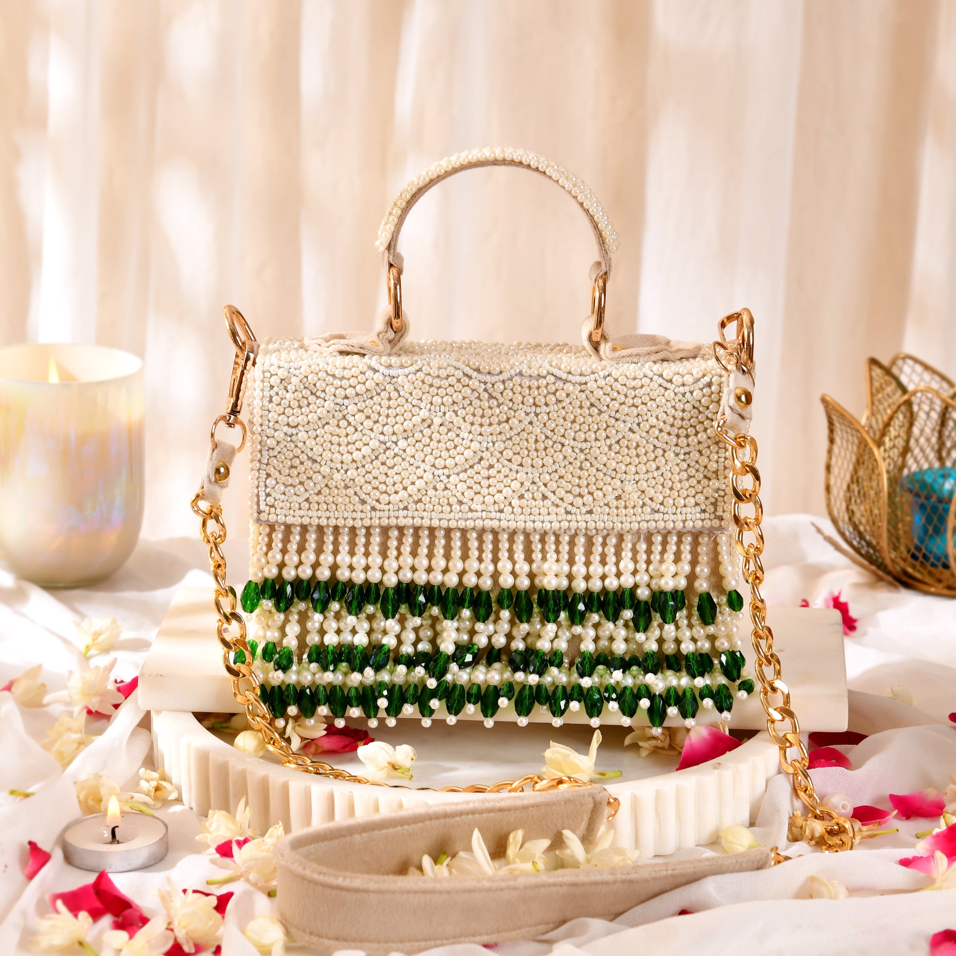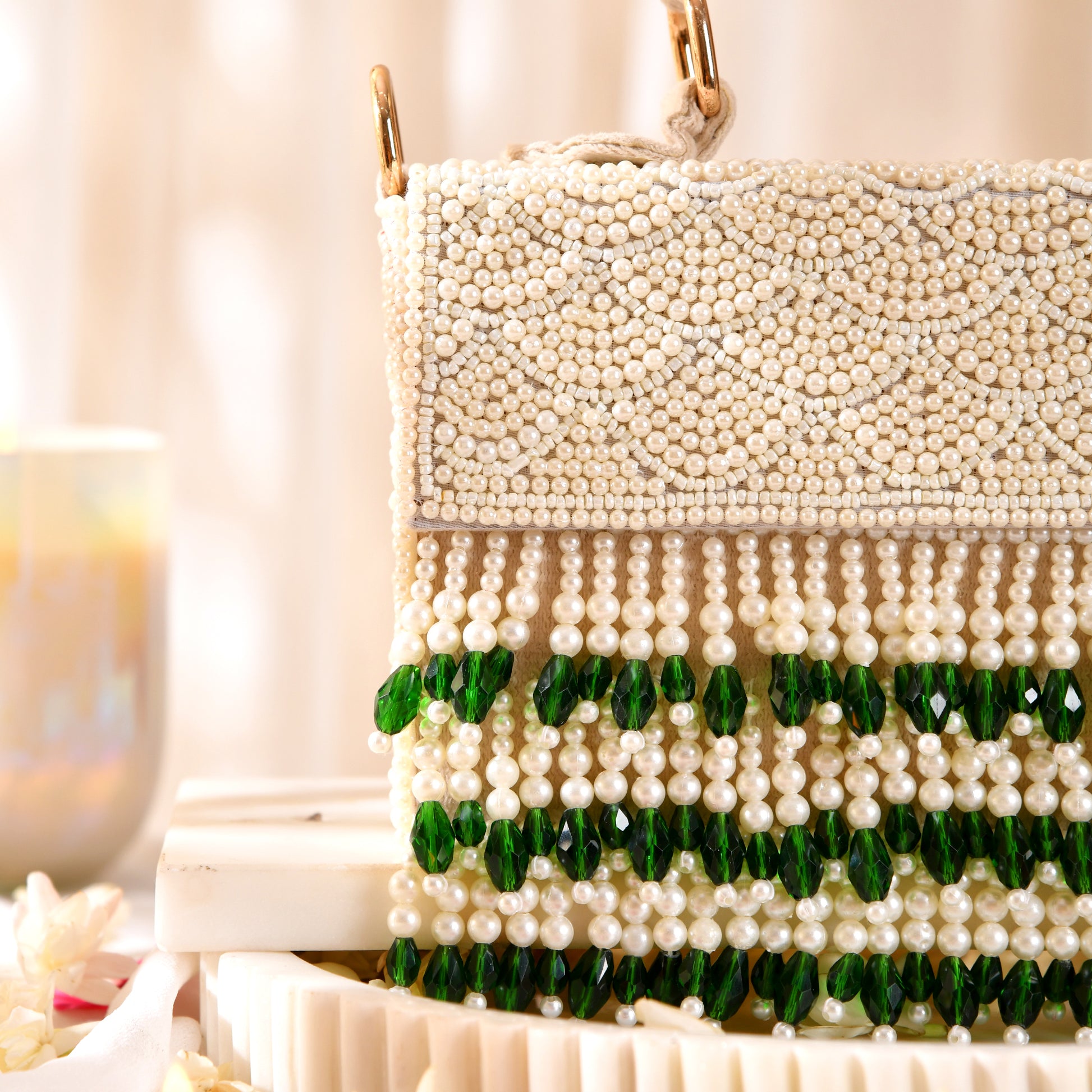 A stunning handcrafted bag adorned with delicate pearls and emerald green bead tassels and a golden chain strap is the perfect statement piece for your festive soirées and bridal wardrobe and elegant occasions. A true blend of tradition and glam.