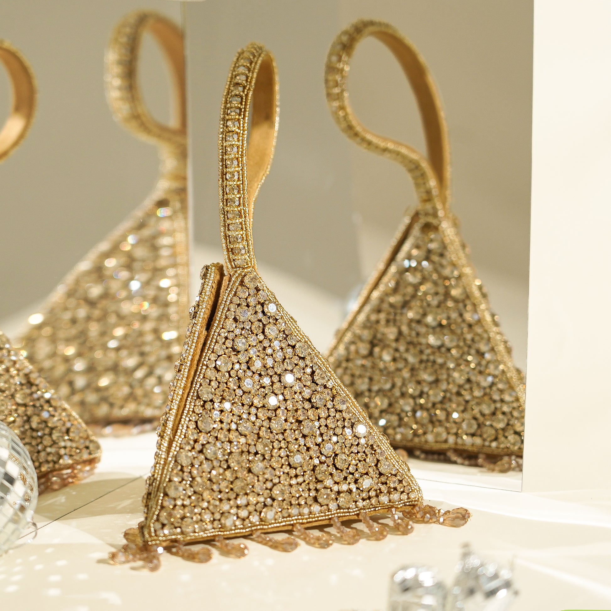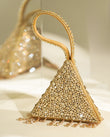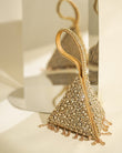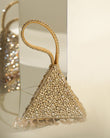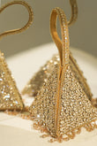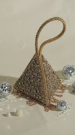“A dazzling, pyramid-shaped mini clutch, encrusted with shimmering crystals and finished with delicate beaded tassels. Its sculptural silhouette and jeweled wrist loop make it the perfect statement accessory for evening glamour.”