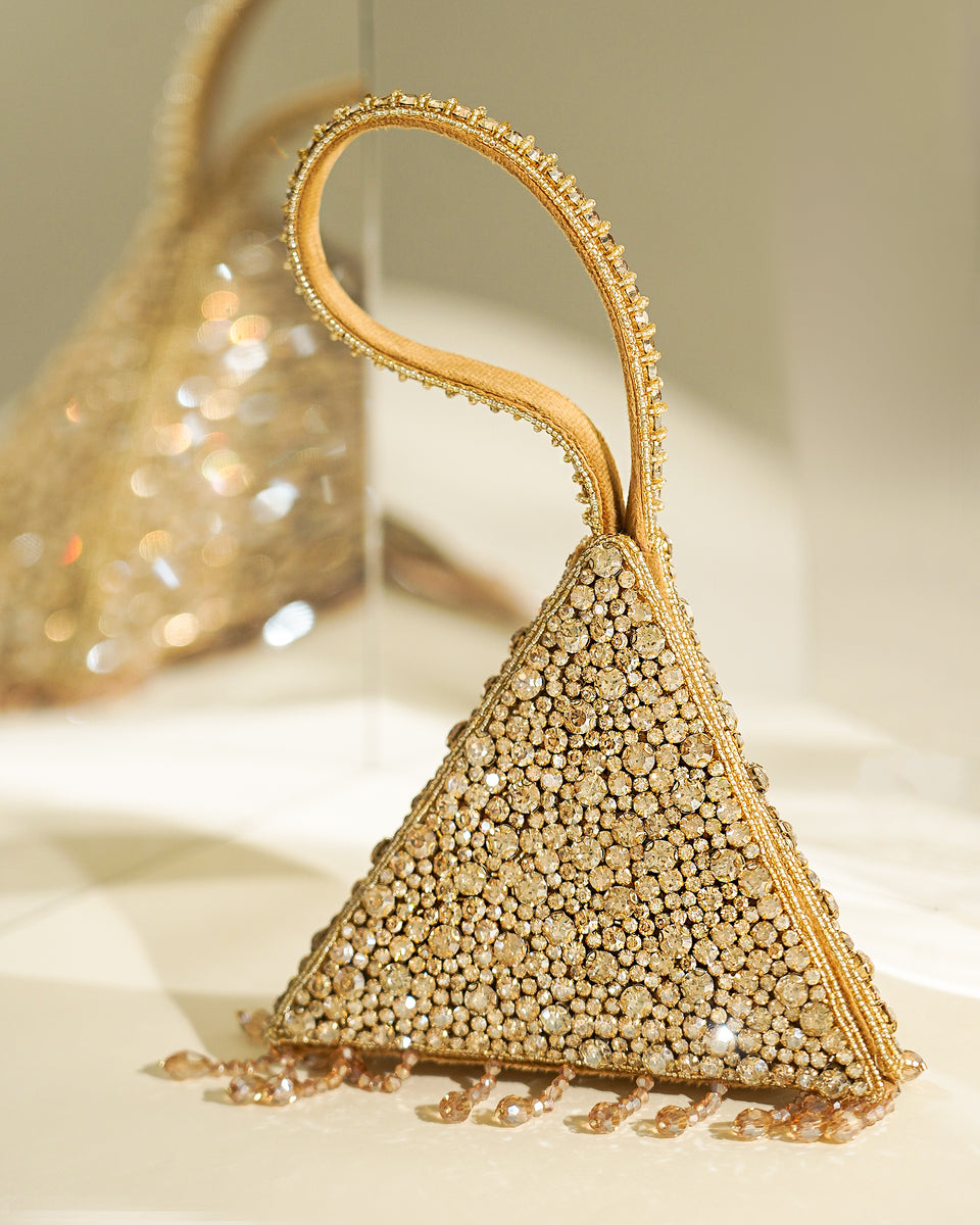 A dazzling, pyramid-shaped mini clutch, encrusted with shimmering crystals and finished with delicate beaded tassels. Its sculptural silhouette and jeweled wrist loop make it the perfect statement accessory for evening glamour.