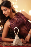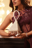 The exterior is completely covered in pristine white beads, creating a luminous, textured finish that catches the light beautifully. Its structured form and high-impact design ensure it stands out as an accessory, not just a necessity. Pair this statement piece with a simple slip dress or sharp Indo-Western attire to let the geometry speak for itself.