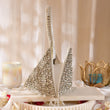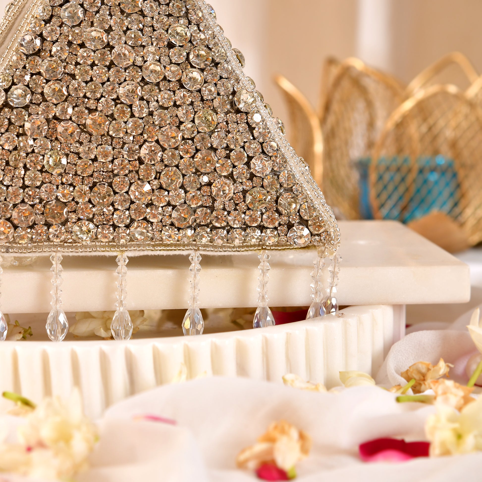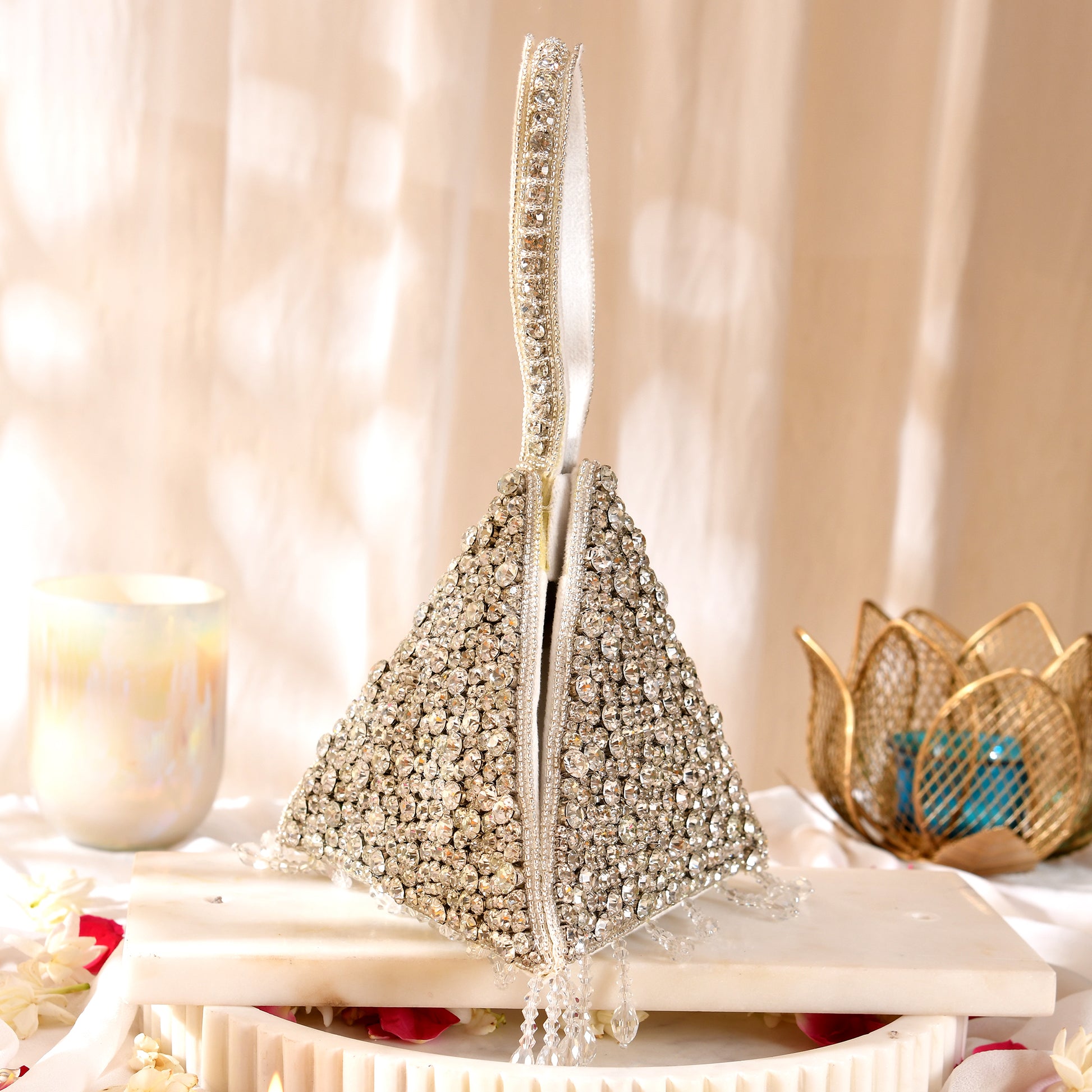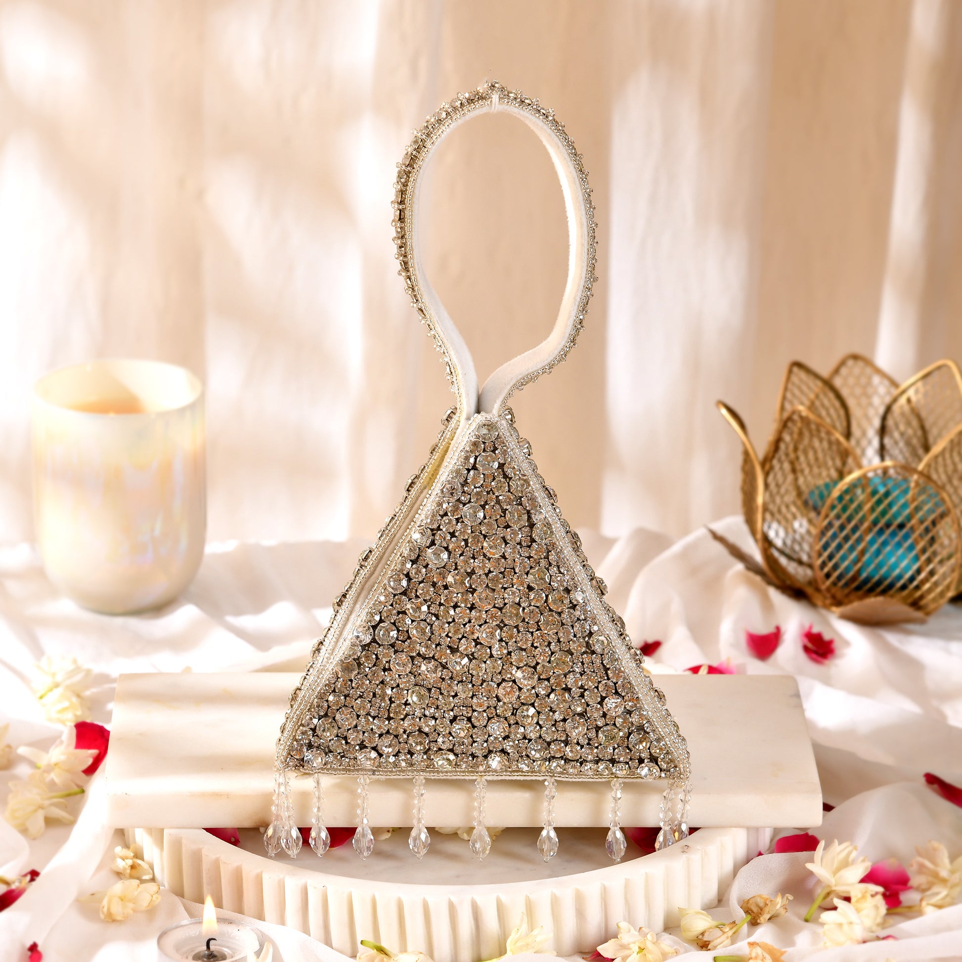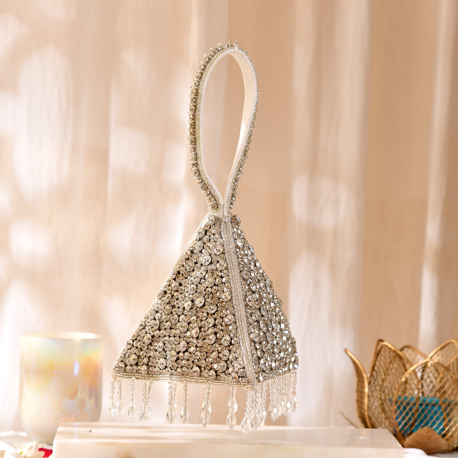 “A dazzling, pyramid-shaped mini clutch, encrusted with shimmering crystals and finished with delicate beaded tassels. Its sculptural silhouette and jeweled wrist loop make it the perfect statement accessory for evening glamour.”