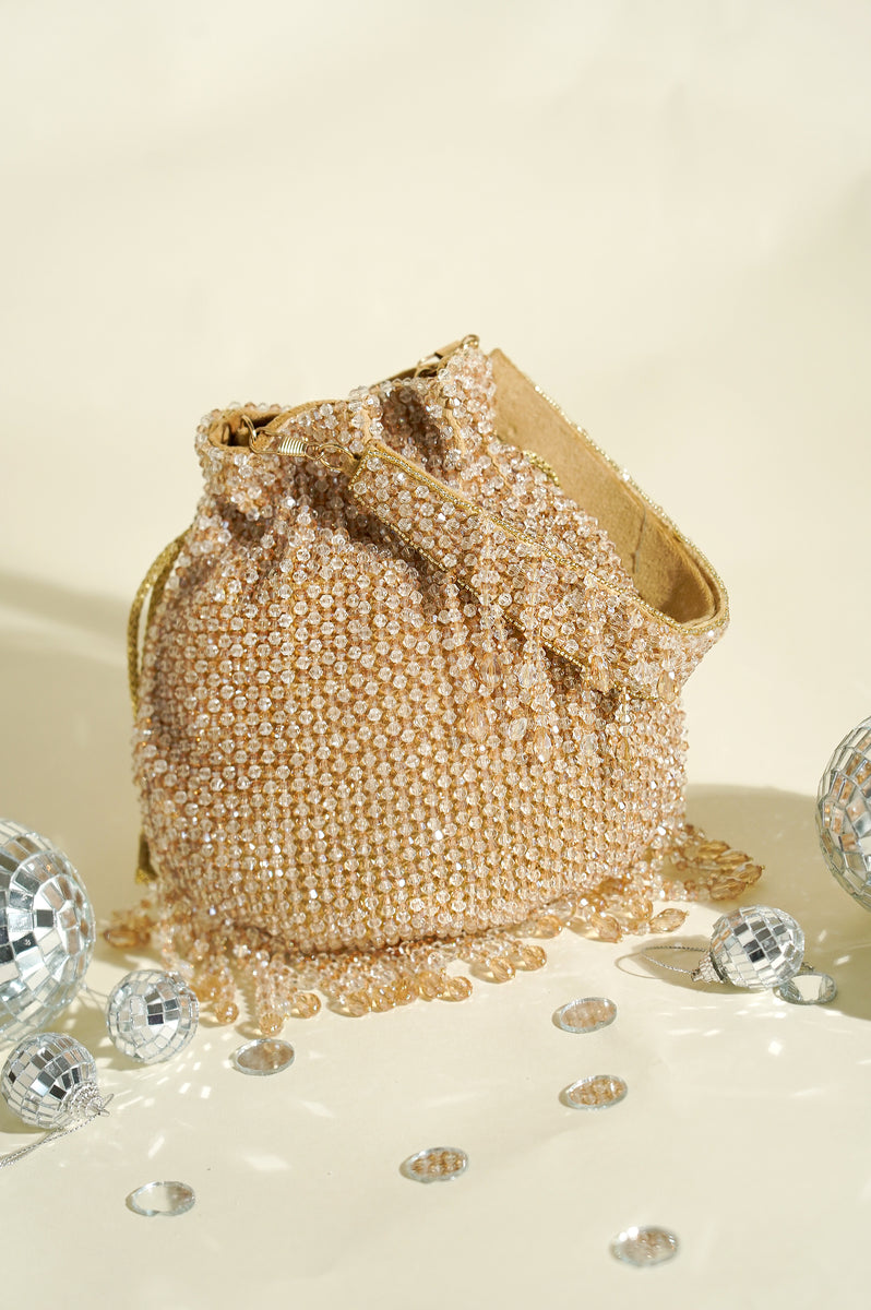 A stunning crystal gold potli, handcrafted with intricate beadwork and luxe detailing—perfect for adding elegance to any festive or bridal look.