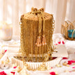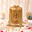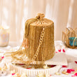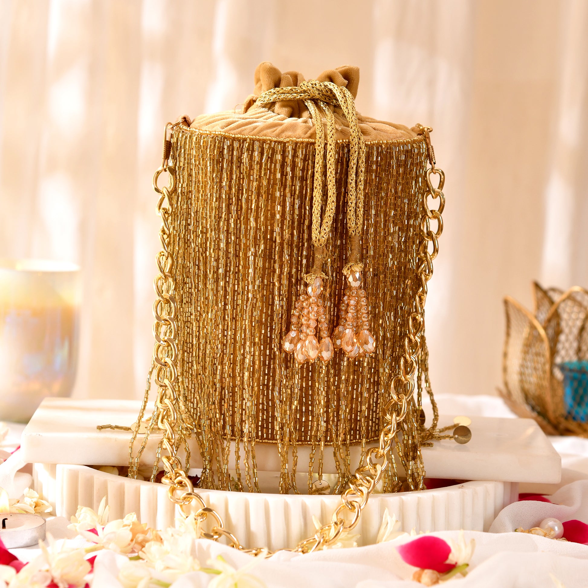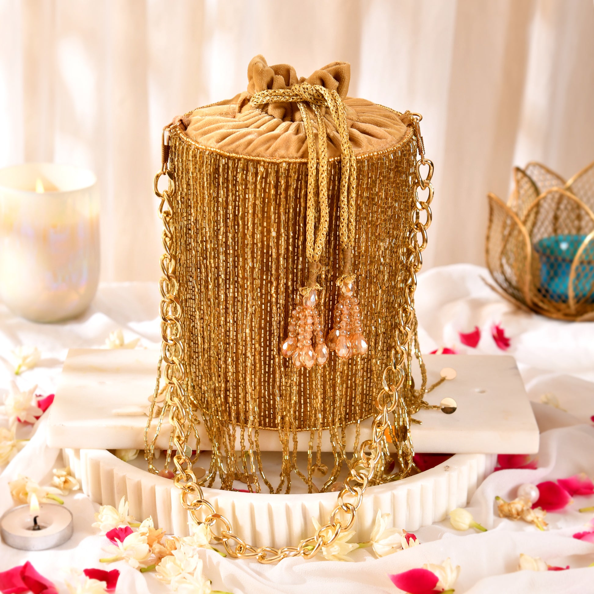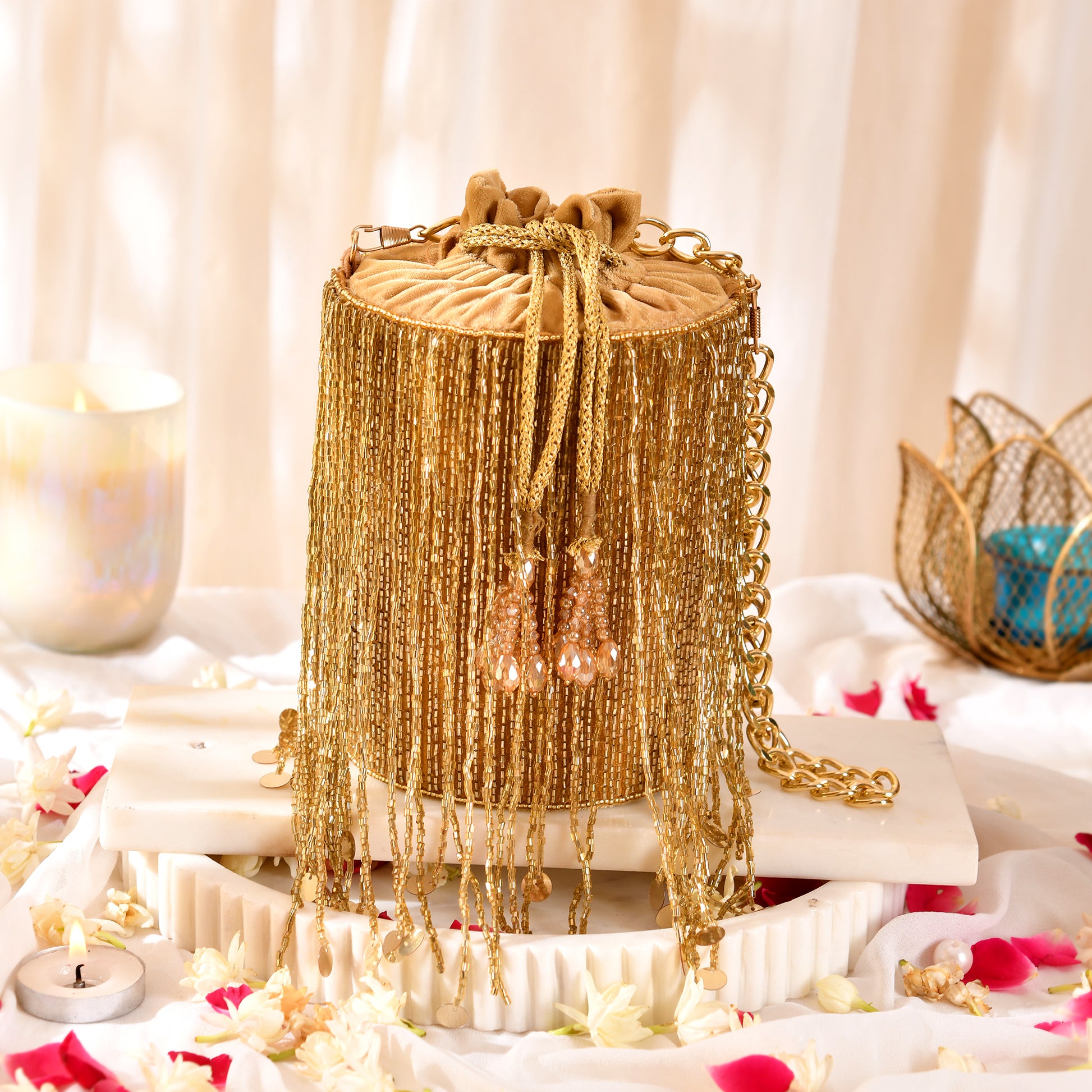 Experience timeless elegance with the Golden Jharoka potli-style bag. Its cylindrical shape and cascading gold beaded fringes make it a stunning accessory for any occasion. With its luxe gold color, this bag exudes sophistication and is sure to elevate any outfit. Perfect for adding a touch of glamour to your wardrobe.