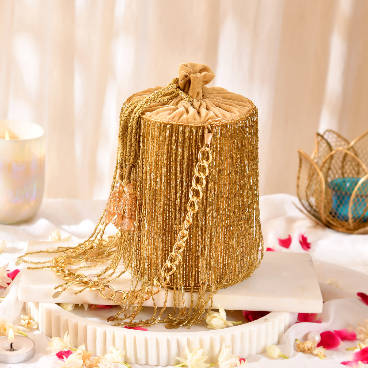 The Golden Jharoka Potli Bag is a handcrafted cylindrical accessory that blends timeless elegance with festive glamour. Featuring cascading gold beaded fringes, this luxe gold bag adds movement and sparkle to every outfit. Perfect for weddings, festive occasions, cocktail parties, or evening events, it pairs beautifully with sarees, lehengas, Indo-western, or contemporary ensembles. Lightweight and stylish, this potli is the ideal statement piece to elevate any look.