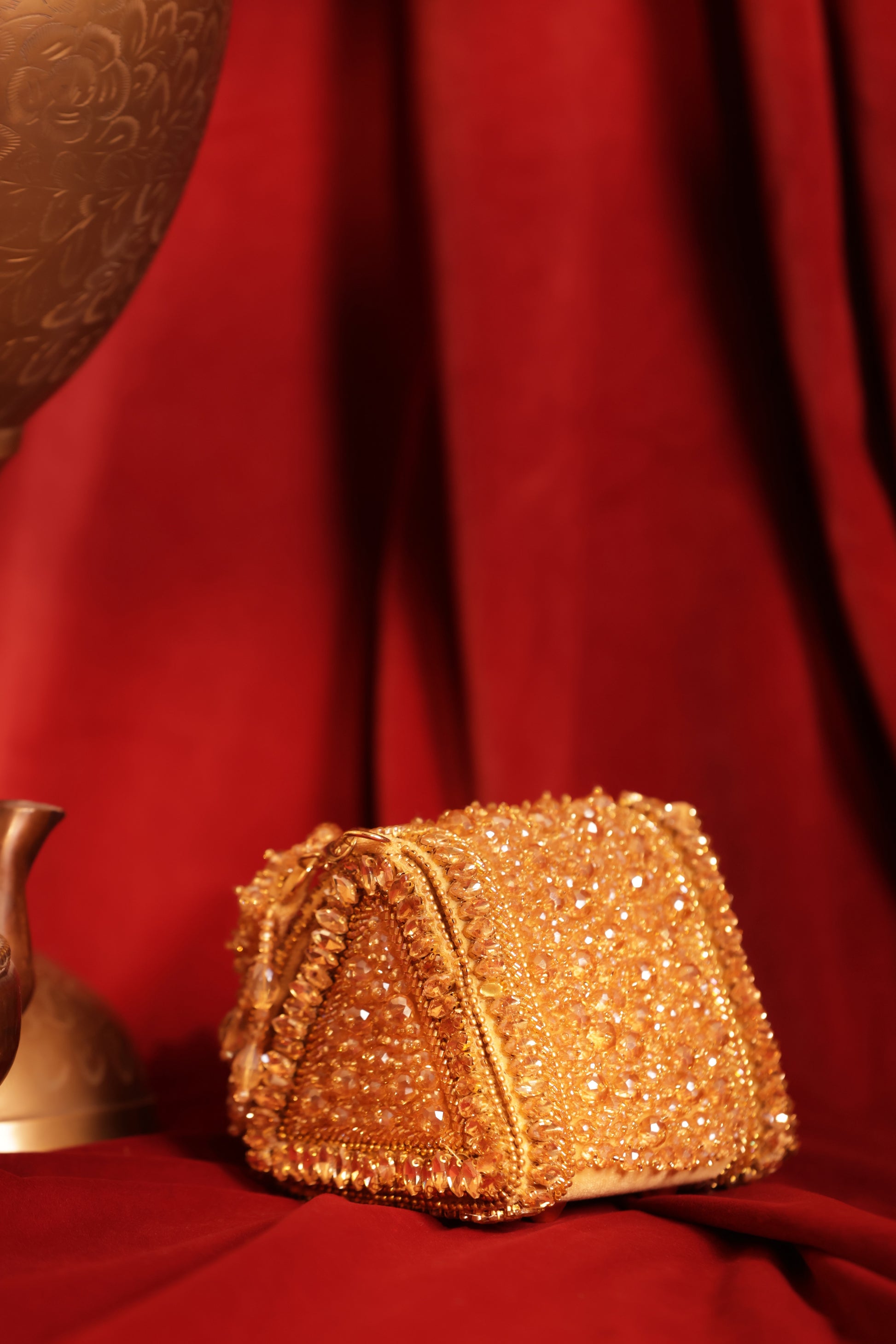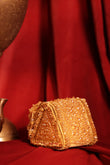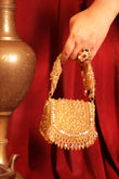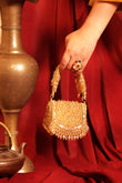A chic golden mini bag adorned with shimmering studs, crafted to add a touch of luxury to any outfit.