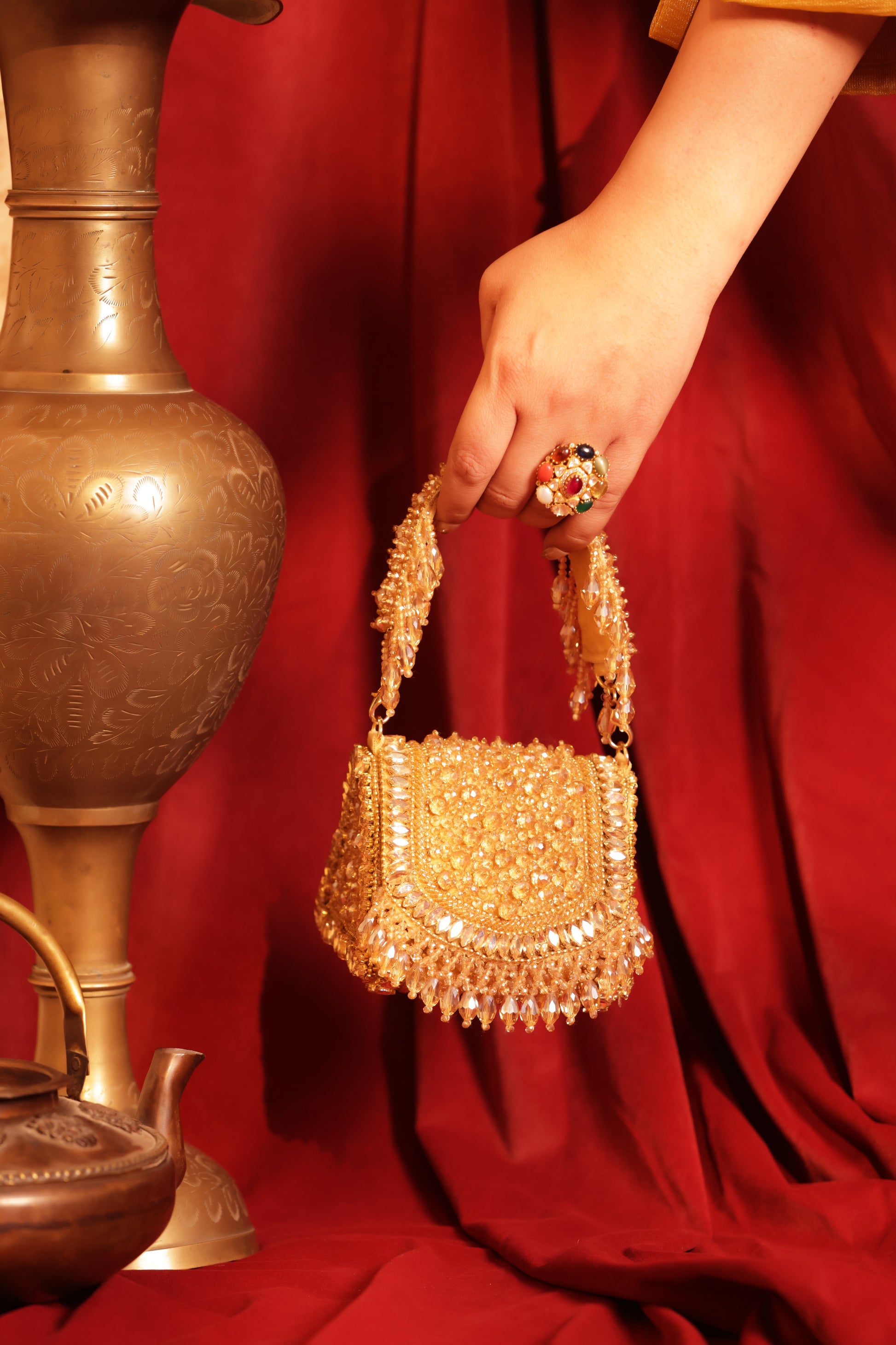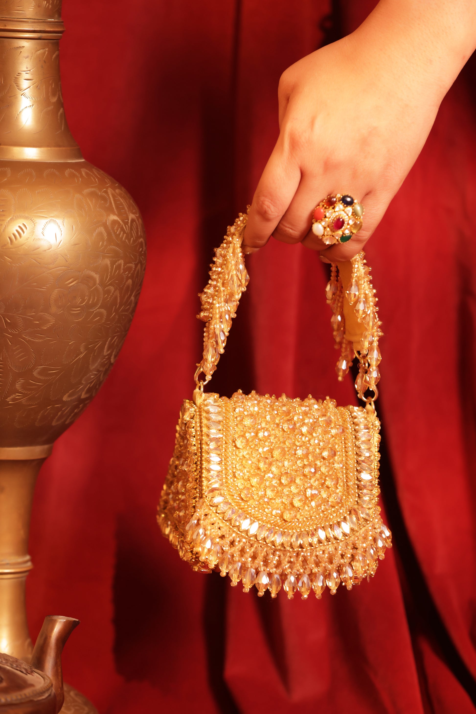 Lightweight, refined, and visually striking, this potli pairs beautifully with silk sarees, lehengas, anarkalis, Indo-western fits, and even contemporary evening wear. With a soft inner lining and a spacious interior, it holds all your essentials while making an unmistakable style statement.