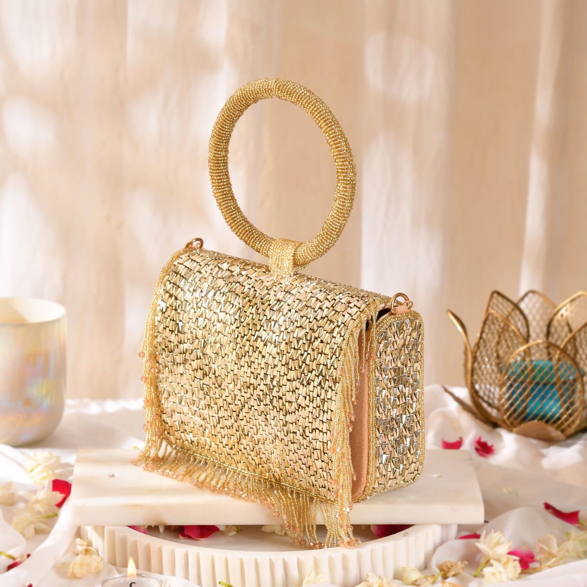 The Golden Zest Gleam Halo Bag is a handcrafted statement accessory designed to elevate any outfit. Featuring intricate beadwork, a signature circular handle, and delicate fringe detailing, this bag exudes festive glamour. Lightweight and versatile, it can be carried handheld or crossbody, making it perfect for weddings, festive nights, cocktail parties, or evening events. Pair it with sarees, lehengas, Indo-western, or contemporary outfits for a look that shines effortlessly.
