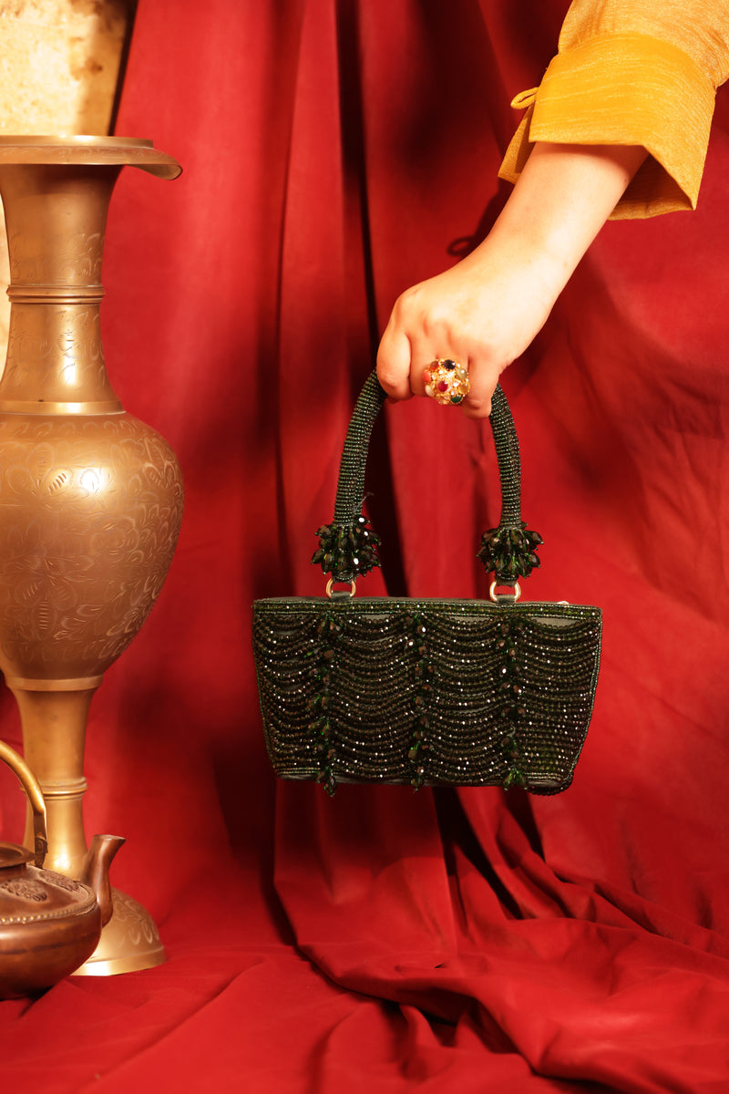 Crafted with rich green tones and adorned with radiant crystals, this clutch brings elegance and glamour together in one standout piec