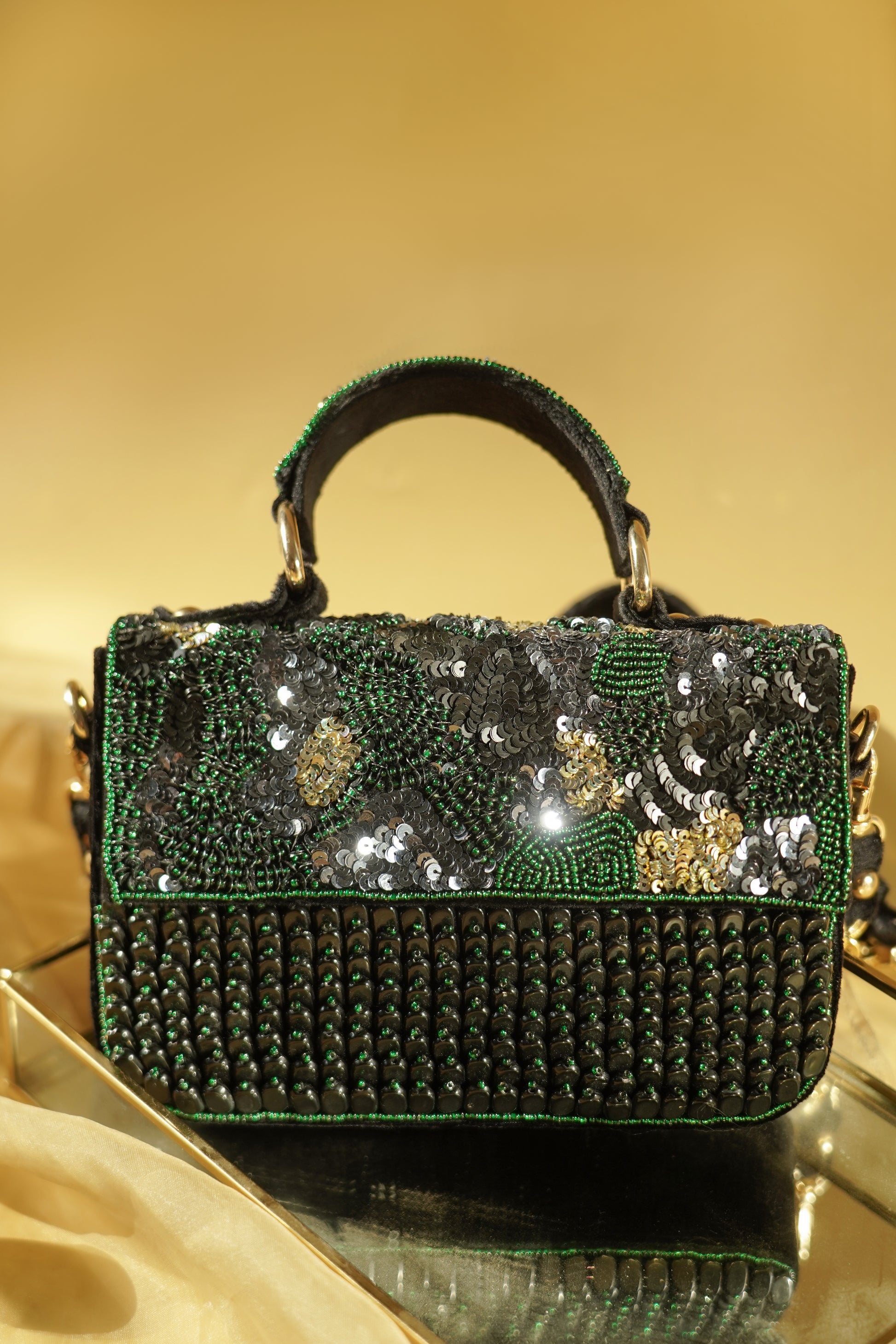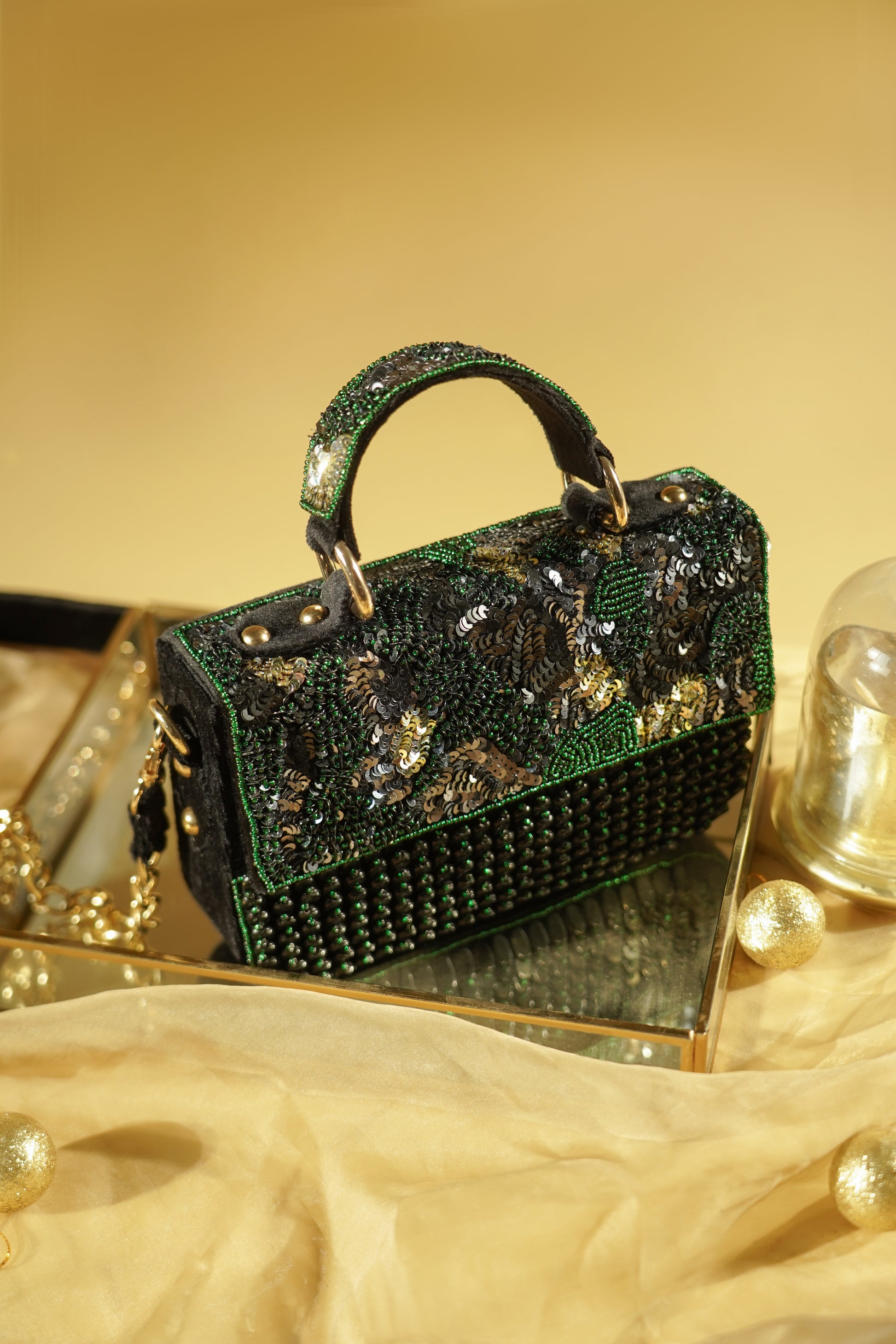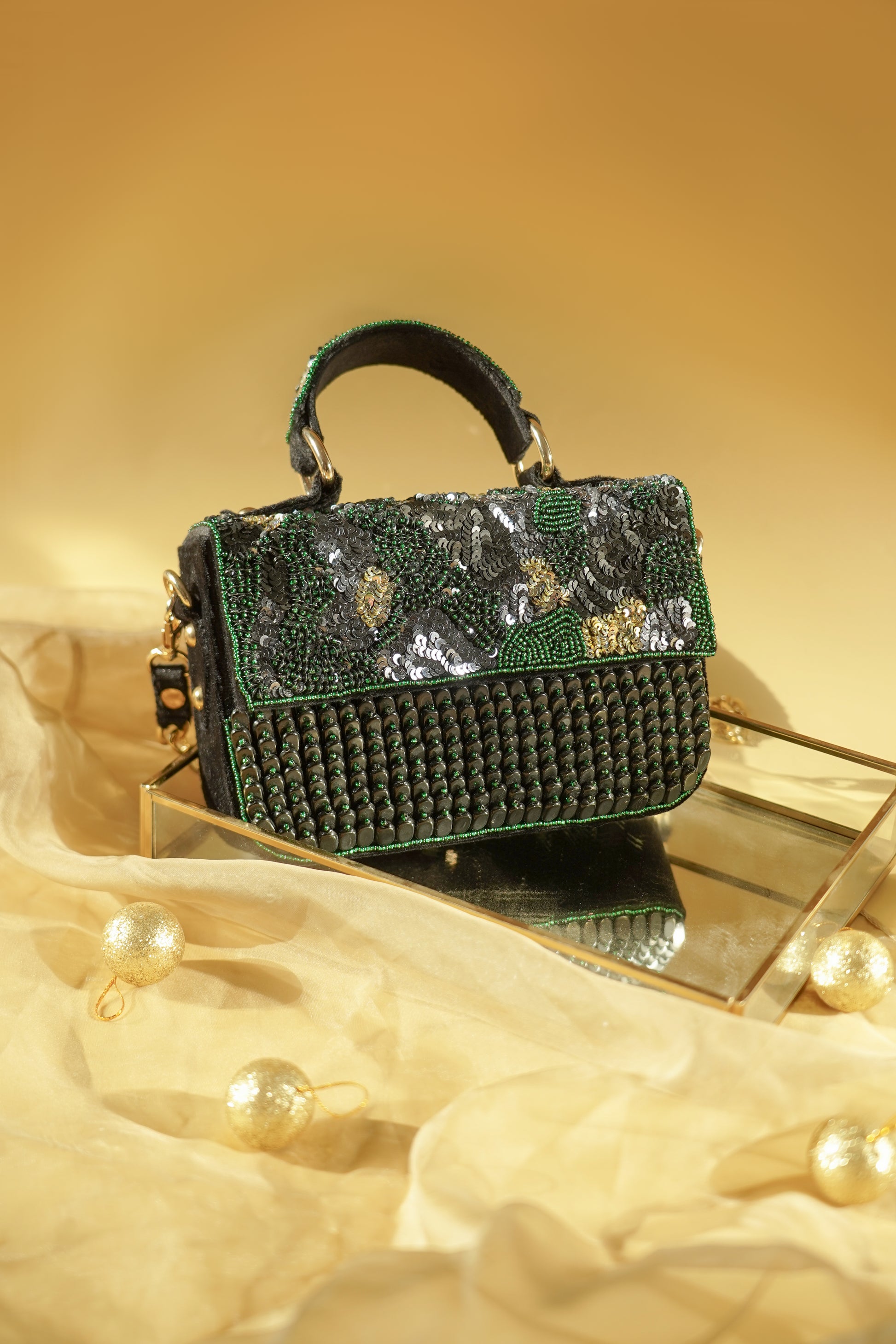 Lush and elegant, this structured green clutch is embroidered with botanical motifs and hand-beaded textures that evoke the charm of a moonlit forest. With its top-handle silhouette and rich emerald tones, it’s perfect for cocktail events, festive celebrations, or evening garden parties.