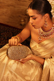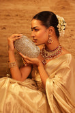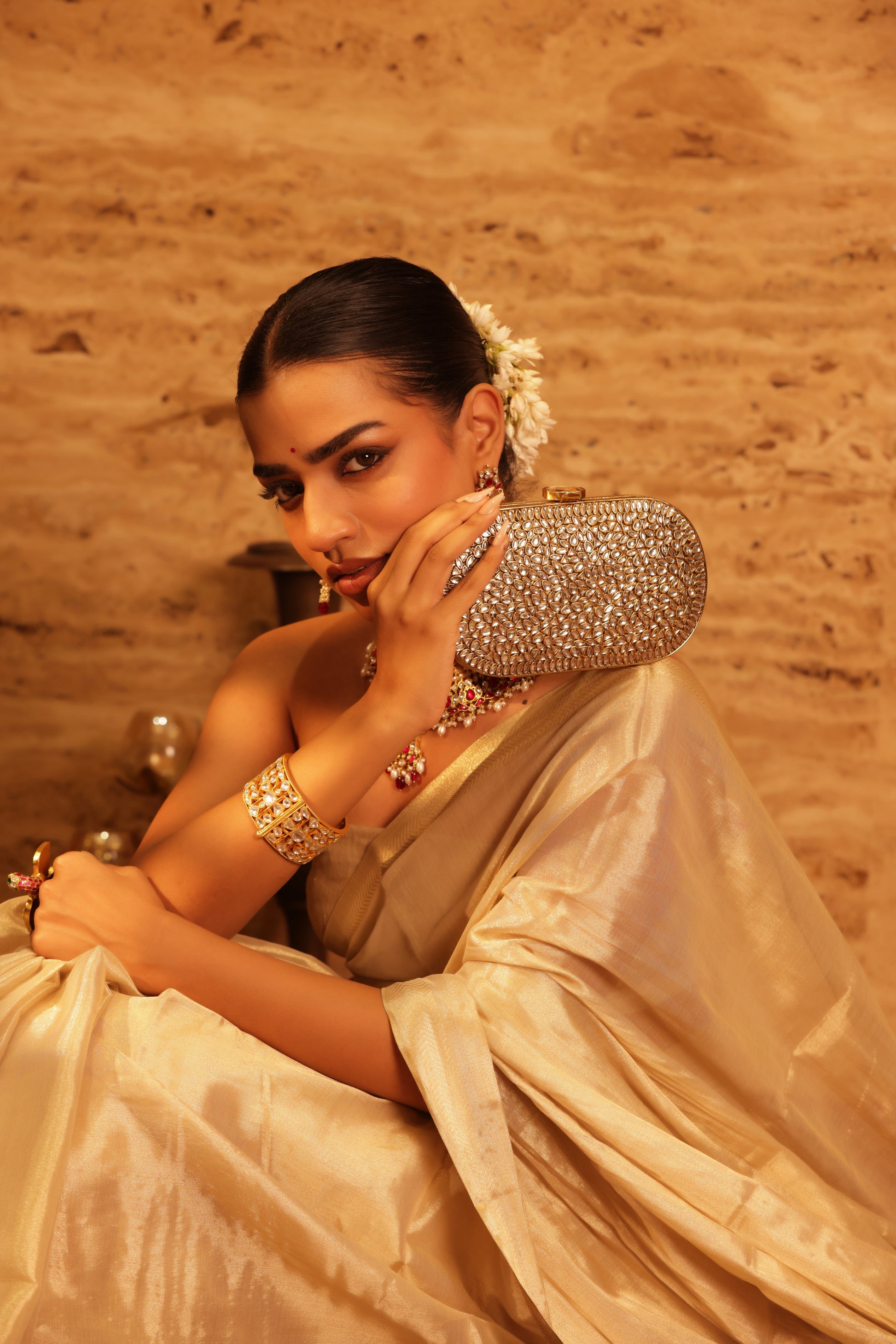 The Kundan Royale Oval Clutch is a true celebration of Indian craftsmanship. Handcrafted in a rich gold base, it features premium kundan stones set across a long oval silhouette that feels both regal and contemporary.