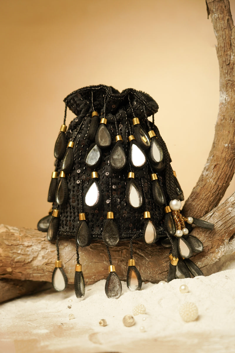 Embrace opulence with our Majestic Mirror black Potli, a masterpiece of elegance and craftsmanship. Handcrafted with meticulous detail, this potli features luxurious golden hues and intricate mirror embellishments, creating a mesmerizing blend of tradition and contemporary flair.
