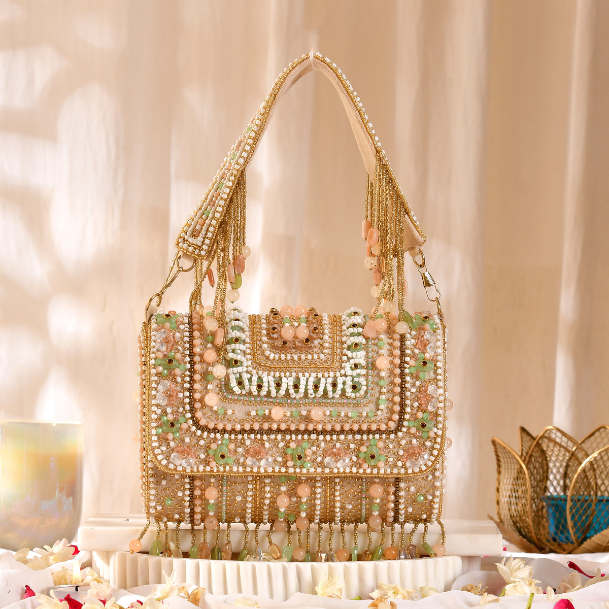 Our beaded bags are handcrafted with delicate embellishments and intricate detailing. Slight variations in bead placement, color, or finish are natural and reflect the unique, artisanal quality of each piece.