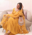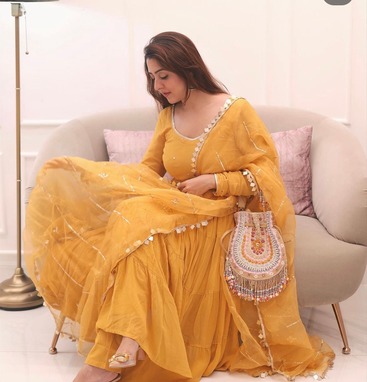 Composition: Gold Suede with kundan work, mirror embellishments, thread embroidery, and tassel detailing