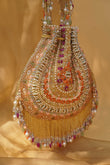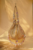 Inspired by regal Mughal florals, this crescent-shaped potli is a masterpiece of hand embroidery, kundan accents, and mirror work. Adorned with multicolor tassels and a delicate braided handle, it's ideal for weddings, sangeet nights, or heirloom-inspired festive looks.
