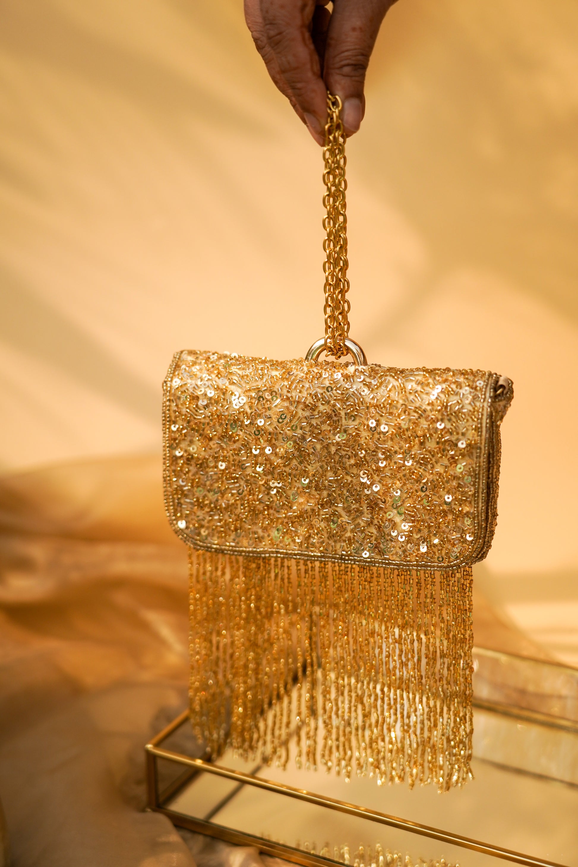 Colour : Golden Size:Length - 25 cms Composition: Golden Sued with sequence and cutdana work Disclaimer :Our beaded bags are handcrafted with delicate embellishments and intricate detailing. Slight variations in bead placement, color, or finish are natural and reflect the unique, artisanal quality of each piece. Care