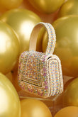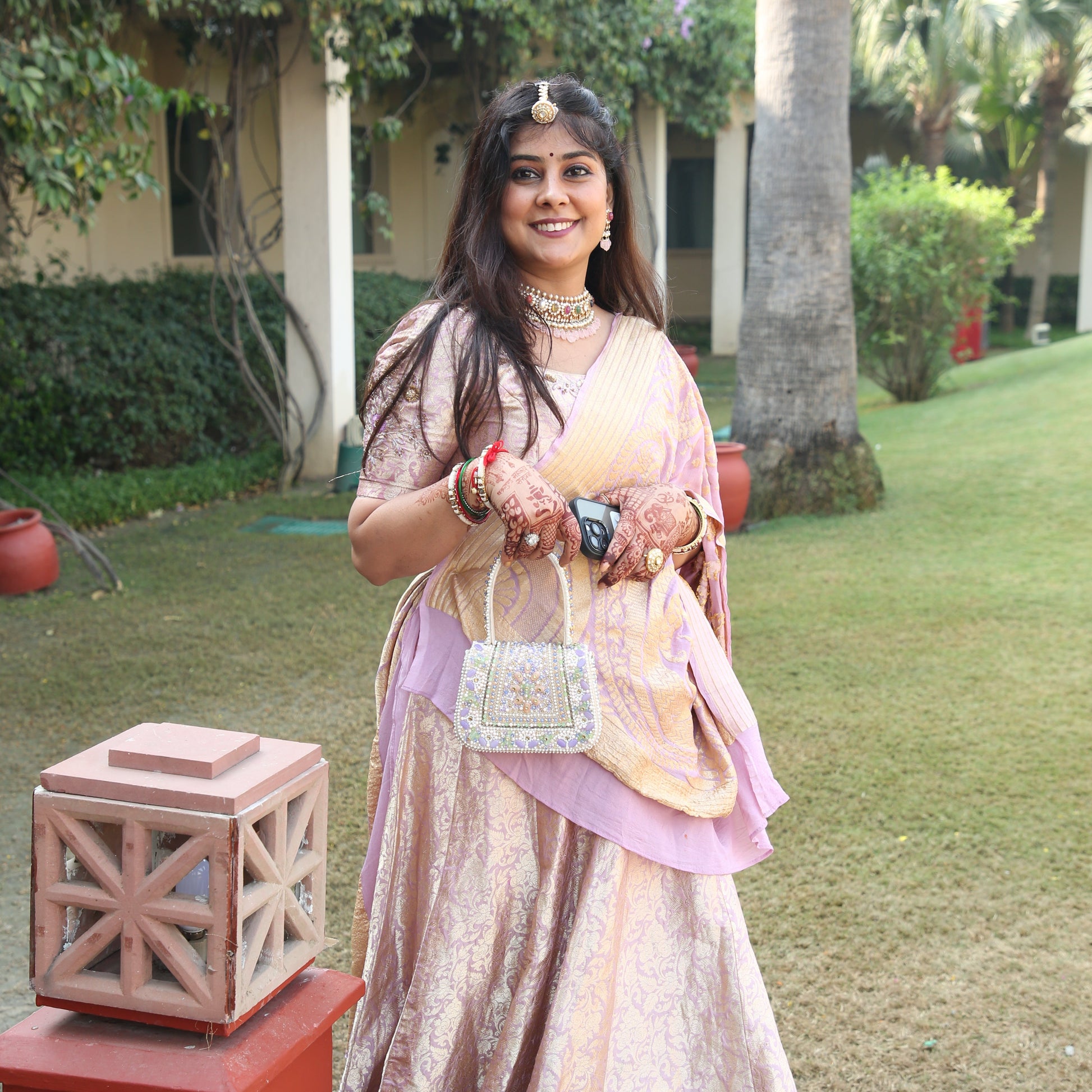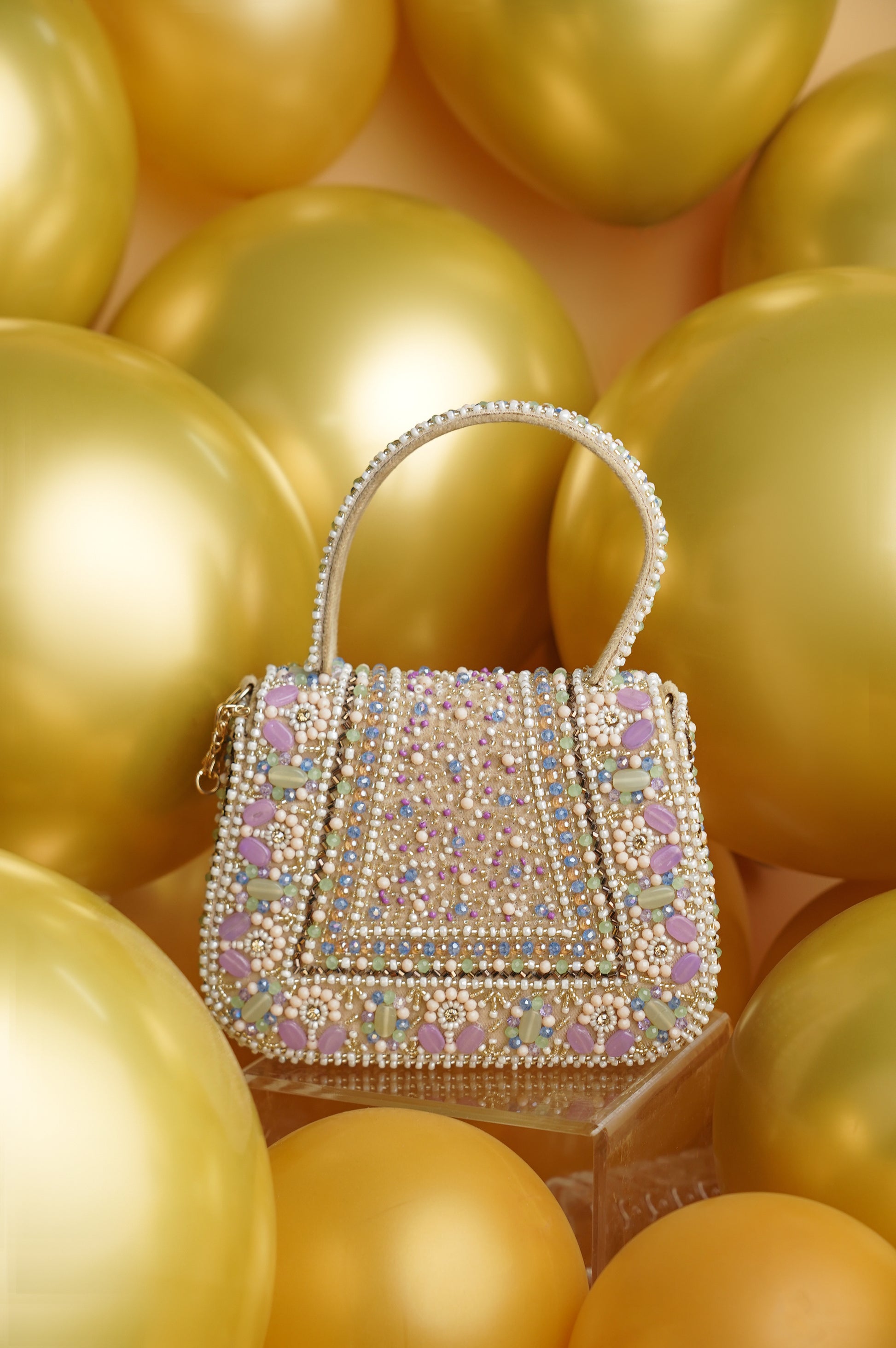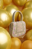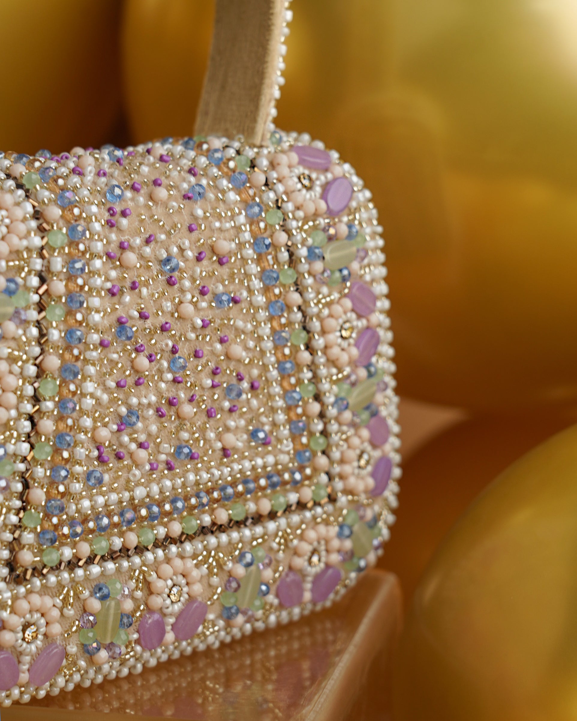 “A dreamy blend of pastel elegance and intricate beadwork, this clutch dazzles with delicate floral patterns and glimmering embellishments. Perfect for festive soirées or a luxe bridal look, it’s a statement of refined glamour and artistic craftsmanship.”