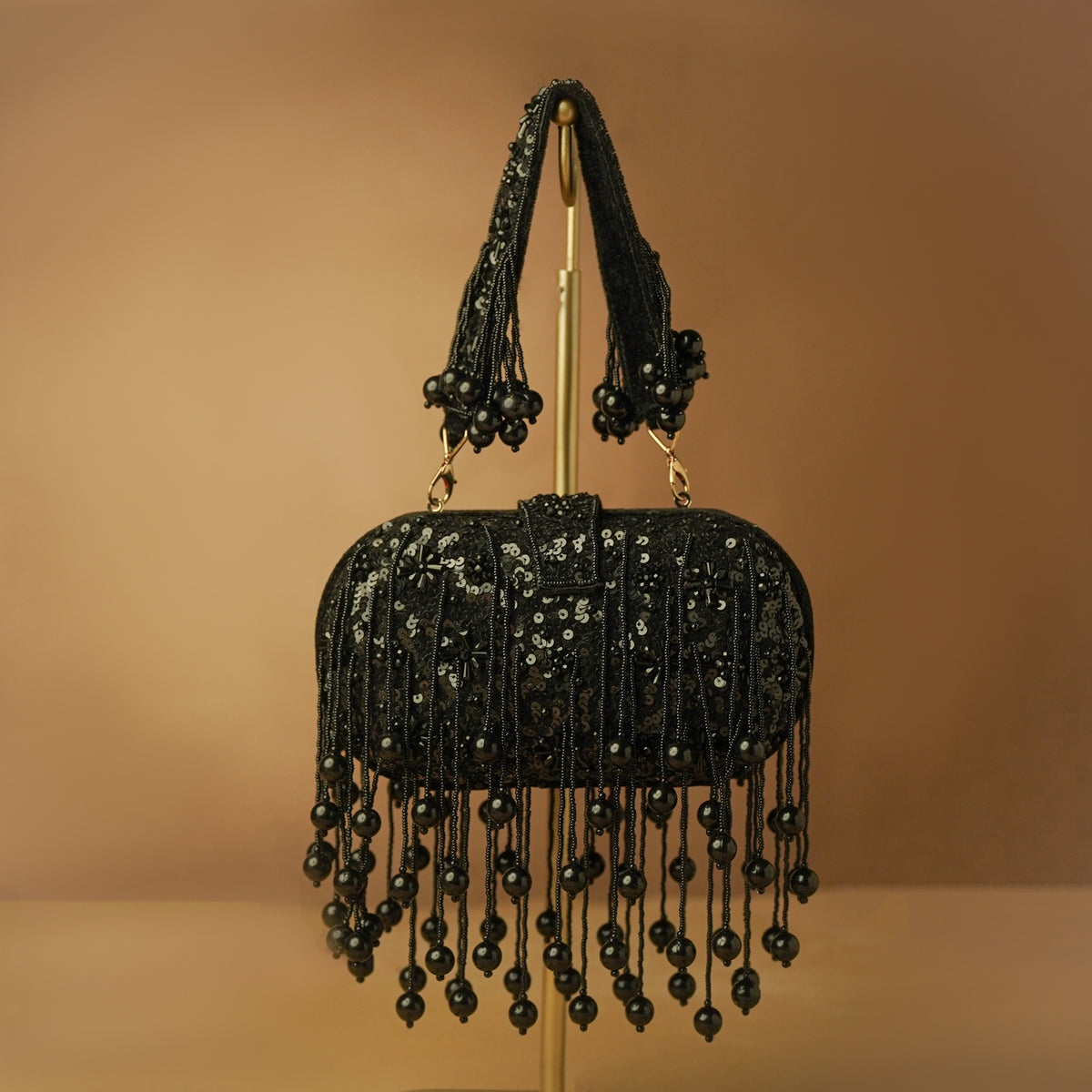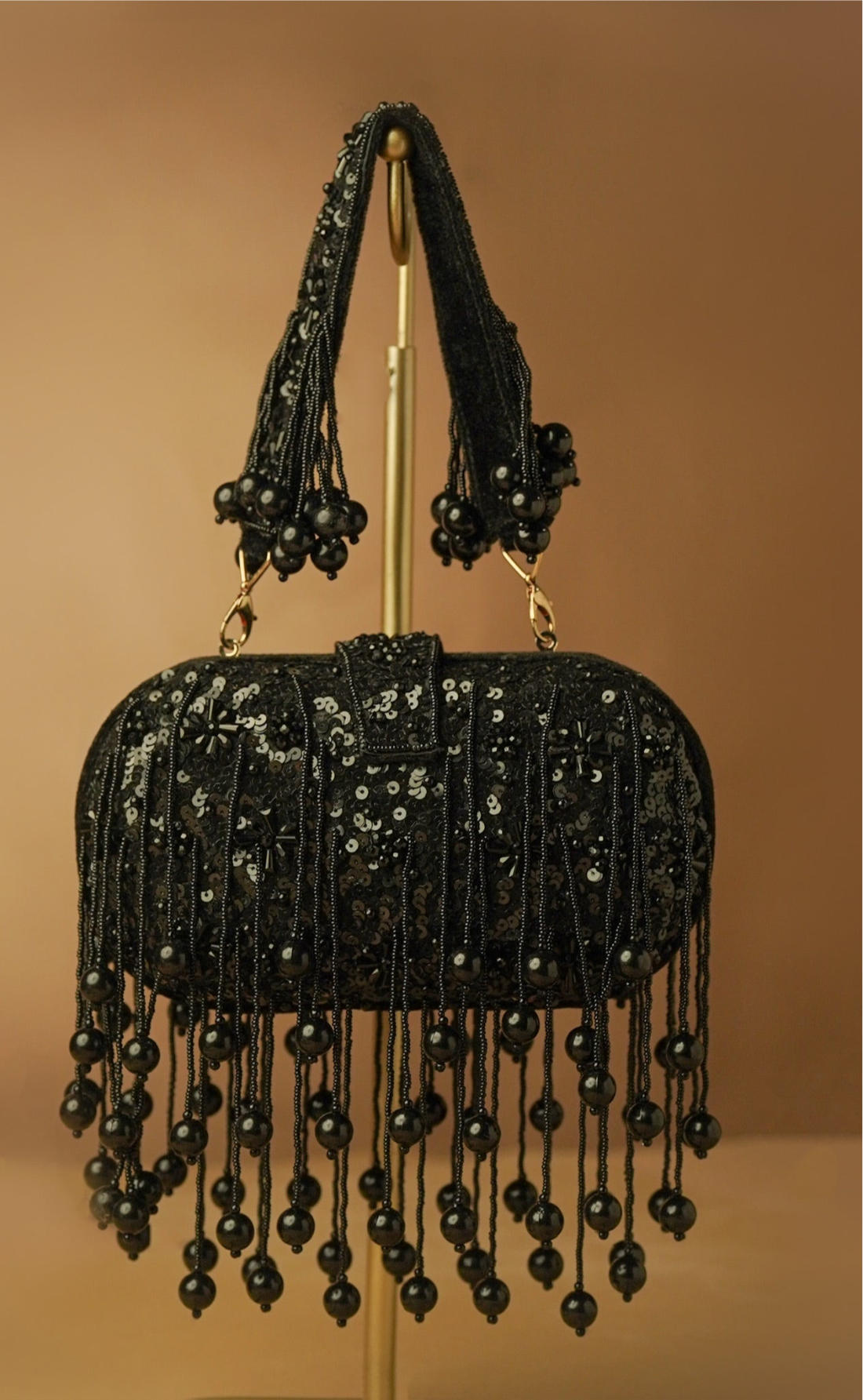 This oval-shaped black bag is adorned with shimmering floral beadwork, a braided handle, and cascading bead tassels that sway with every move. It's bold, opulent, and made for moonlit nights and high-impact entrances.