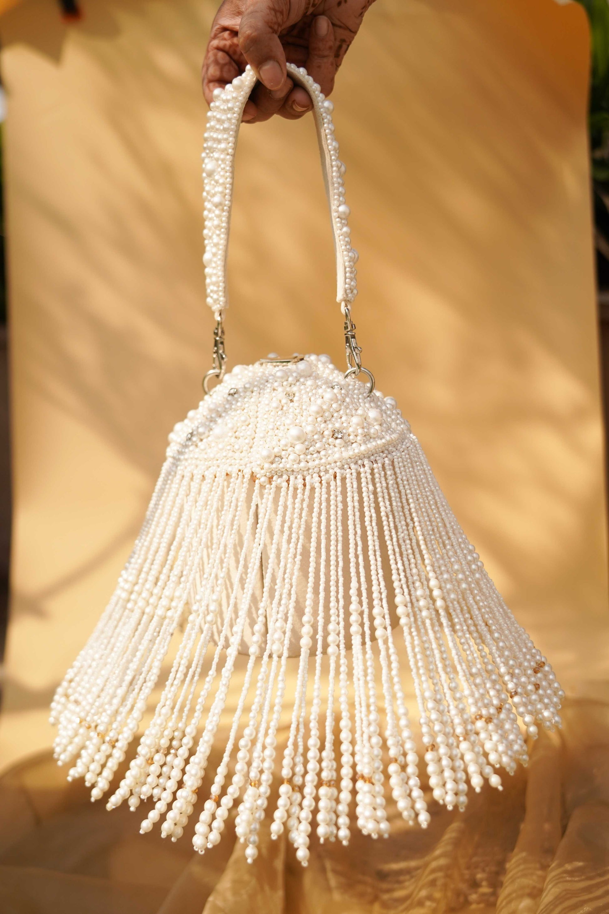 The clutch is an exquisite blend of tradition and glam. Hand-strung pearls cascade in graceful tiers, making it a showstopper for weddings, festive evenings, or bridal trousseaus. It’s not just a bag—it’s a conversation starter.