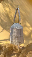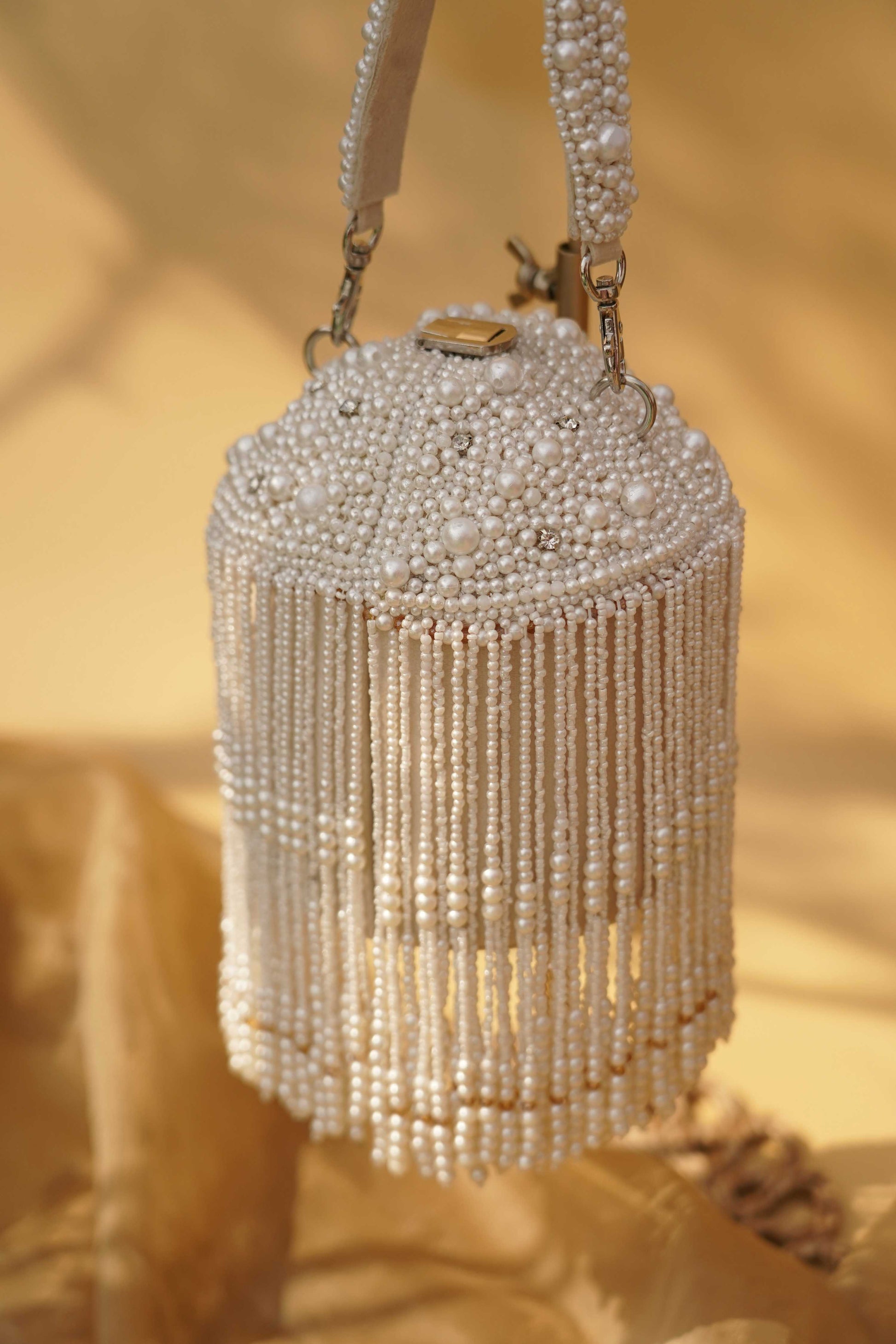 Composition: Cylindrical frame covered in pearl beadwork with dramatic layered pearl fringe and a sturdy pearl handle for easy grip.