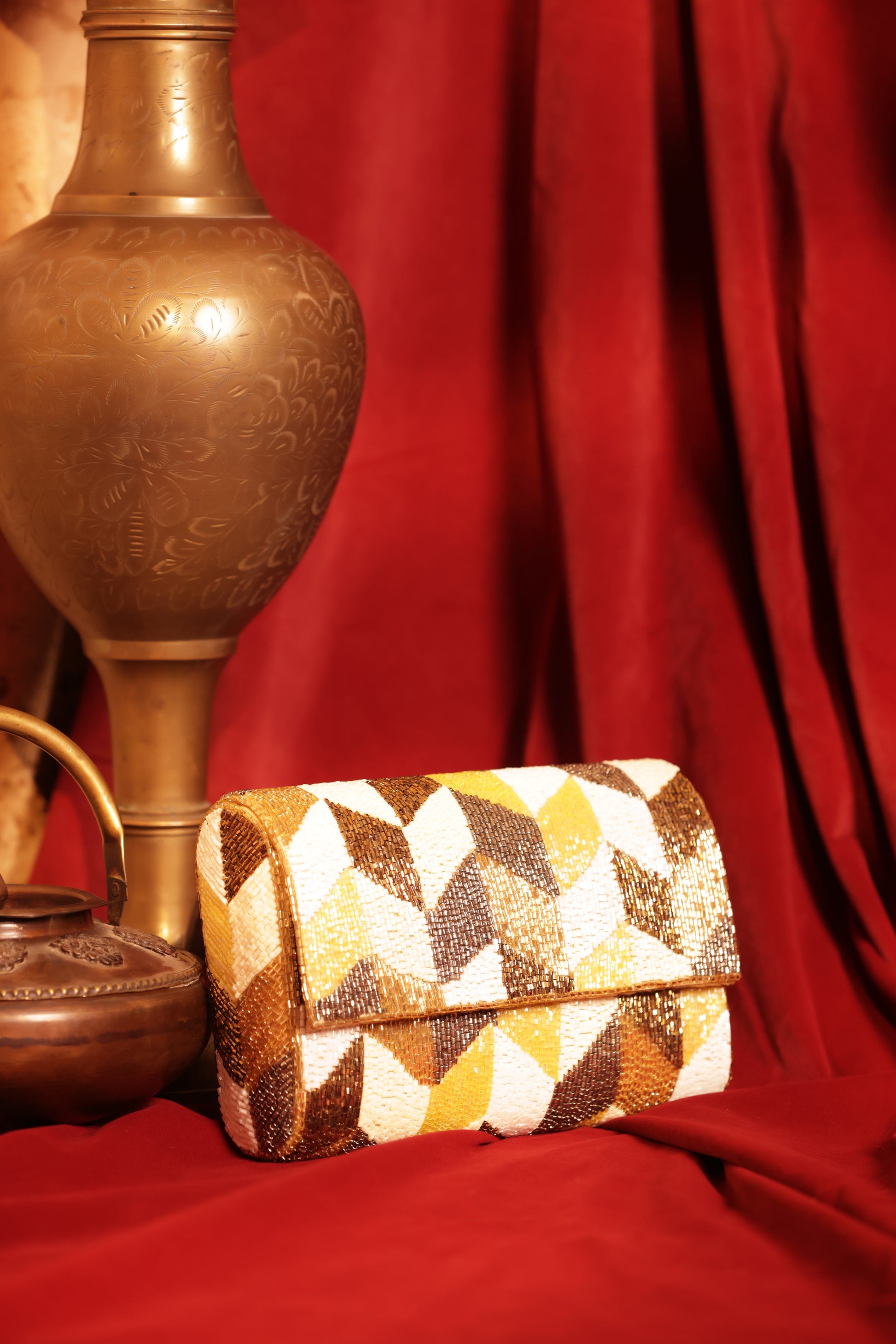 A radiant golden clutch adorned with vibrant, multicolored sequins that create a stunning, eye-catching shine. Perfect for evening events and festive occasions, this clutch adds a touch of luxury and charm to any outfit.