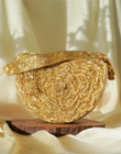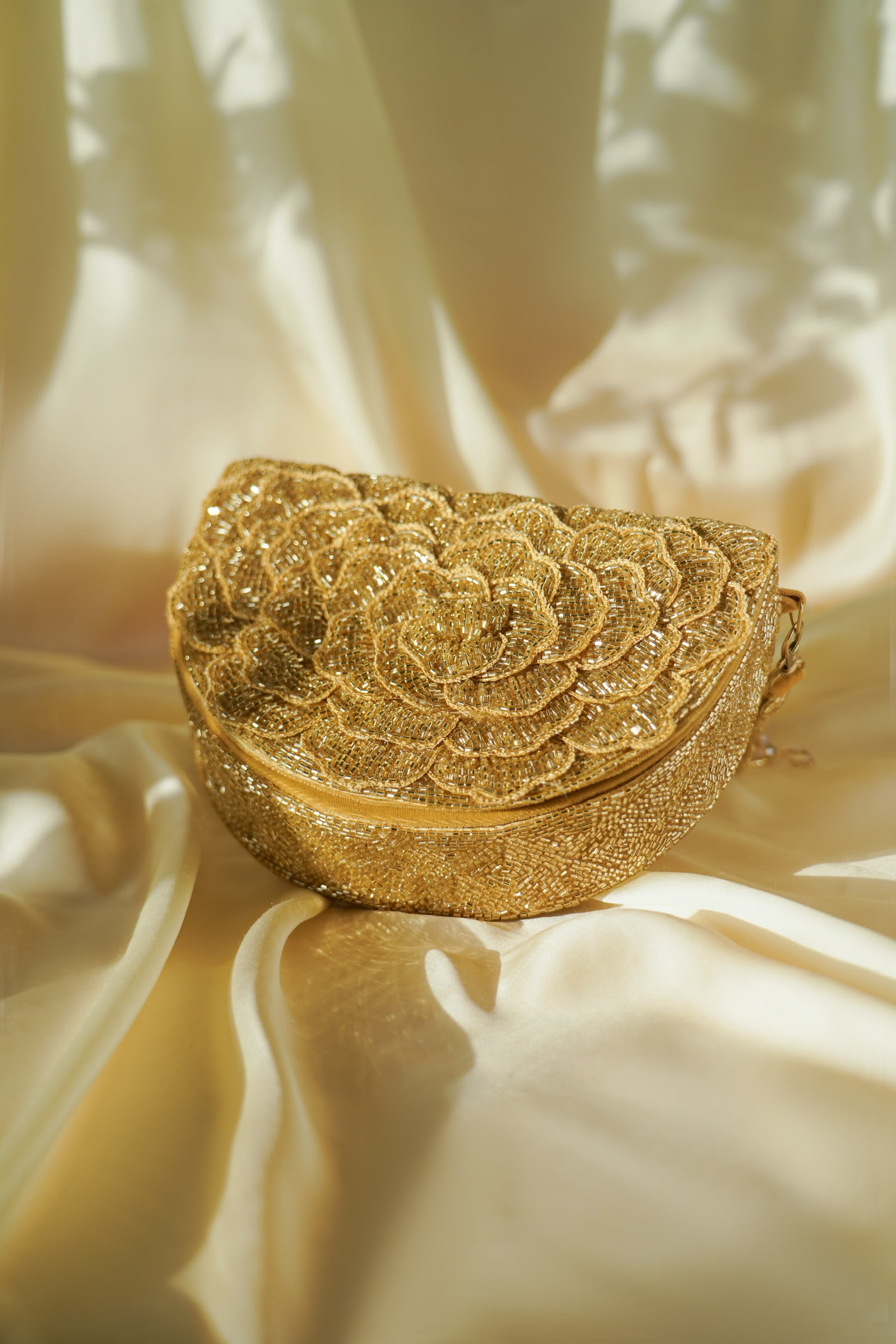 Elegance in Every Thread – This golden handcrafted clutch features intricate floral beadwork and a shimmering finish, perfect for elevating any evening look with timeless sophistication.