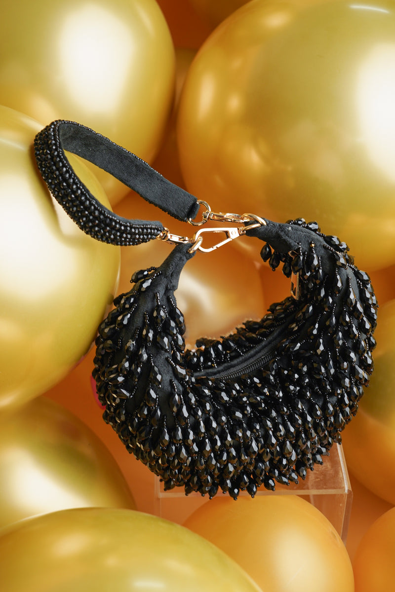 A dazzling mini clutch adorned with black crystals, the Crystal Moon Clutch brings celestial glamour to any evening look. Compact yet captivating—perfect for nights that sparkle.