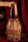 The Noor-E-Anmol Gold Potli is a radiant festive and bridal accessory crafted to bring unmatched elegance to every occasion. Designed with gold fabric, sparkling hand-set crystals, and luxurious dangling crystal fringes, this potli adds a stunning luminous effect with every movement.
