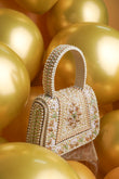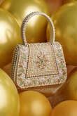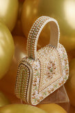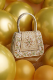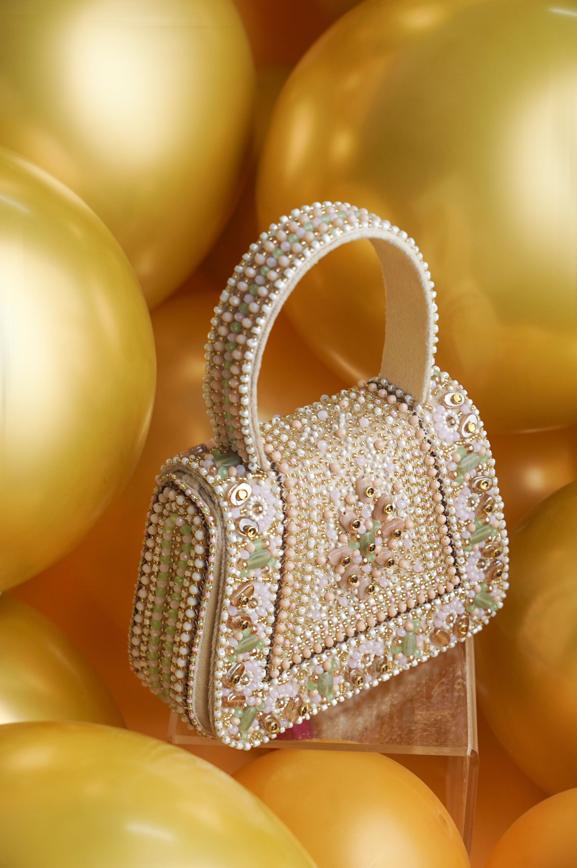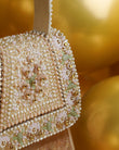 “A dreamy blend of pastel elegance and intricate beadwork, this clutch dazzles with delicate floral patterns and glimmering embellishments. Perfect for festive soirées or a luxe bridal look, it’s a statement of refined glamour and artistic craftsmanship.”