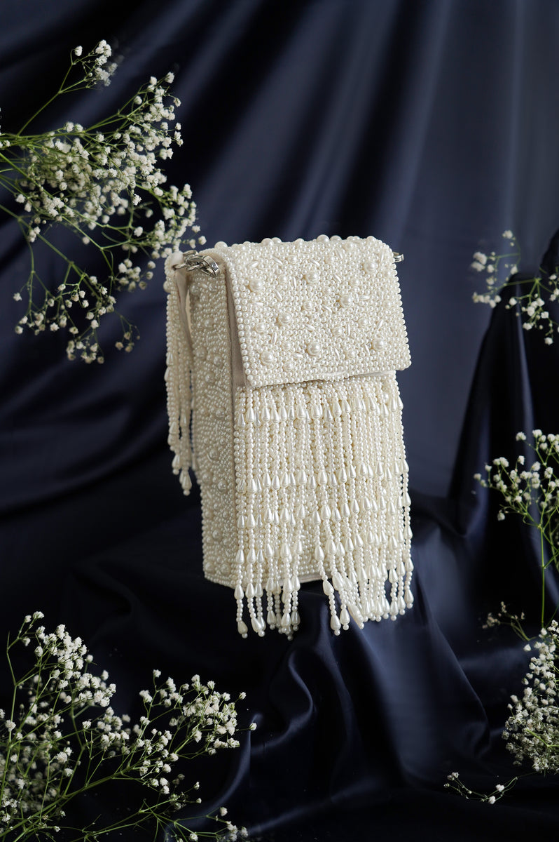 This elegant pearl bag features intricate beading with a luxurious fringe detail, giving it a timeless, vintage charm. Perfect for special occasions, it adds a touch of sophistication and glamour to any ensemble.