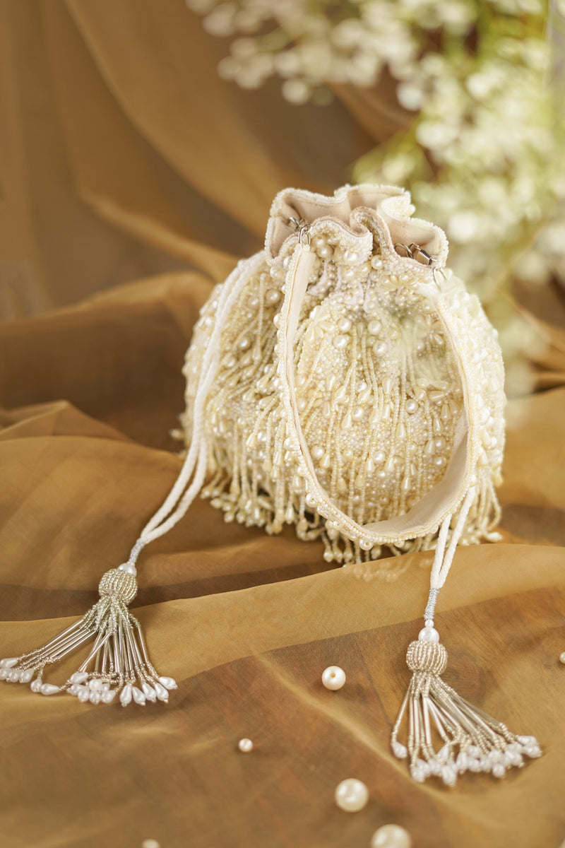 The Zarina Potli is your go-to for regal occasions—an ethereal accessory hand-embellished with off-white sequins, glass beads, and dainty pearl tassels. It exudes a bridal glow but isn’t afraid to steal attention at a festive soirée either.