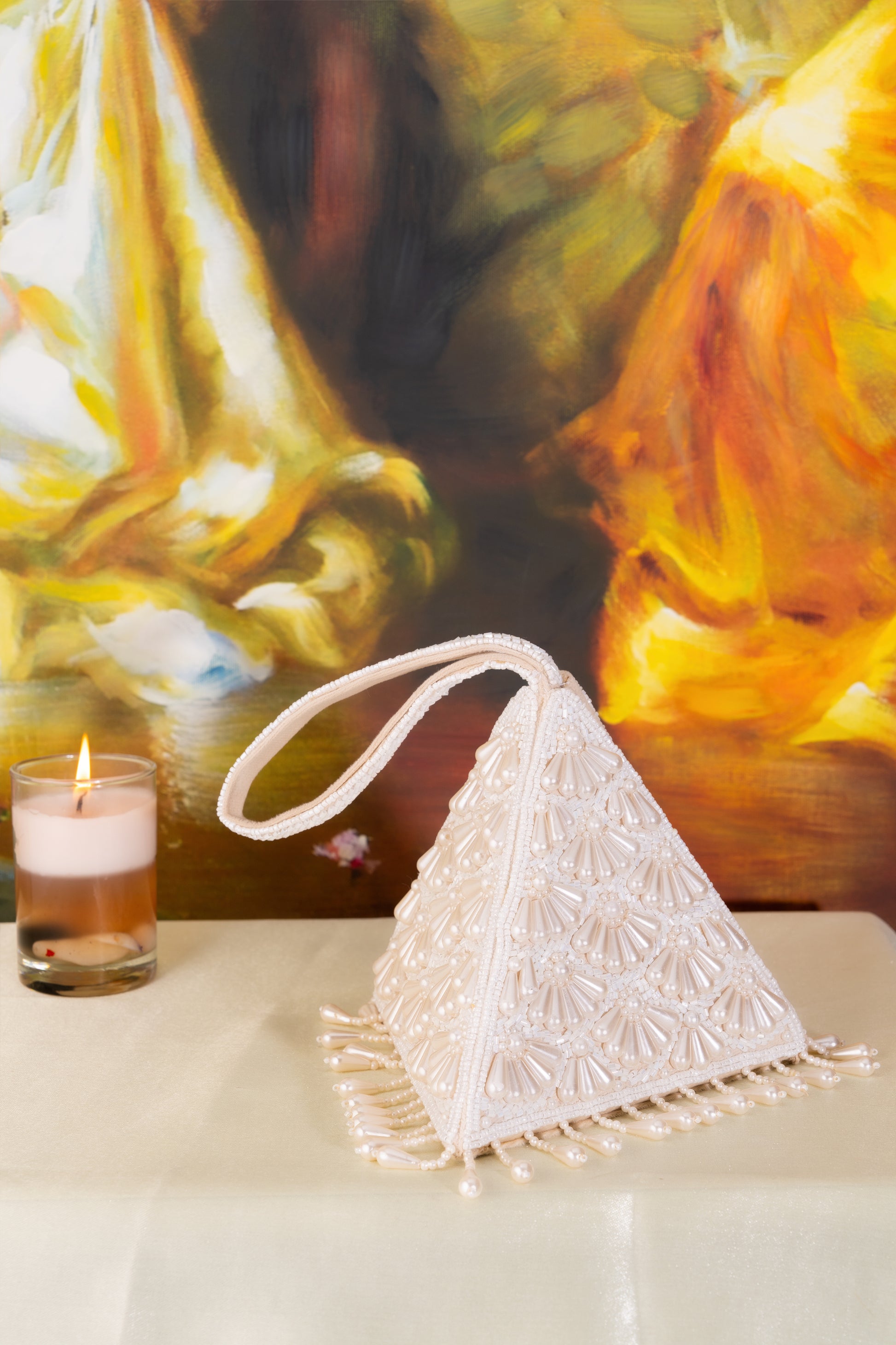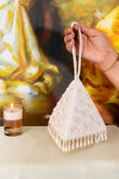 This unique pyramid-shaped bag is hand-embroidered with intricate ivory threadwork and finished with delicate fringe tassels. Elegant, lightweight, and eye-catching—it’s a fresh take on tradition, perfect for mehendi ceremonies, bridal gifting, or minimal festive looks.