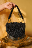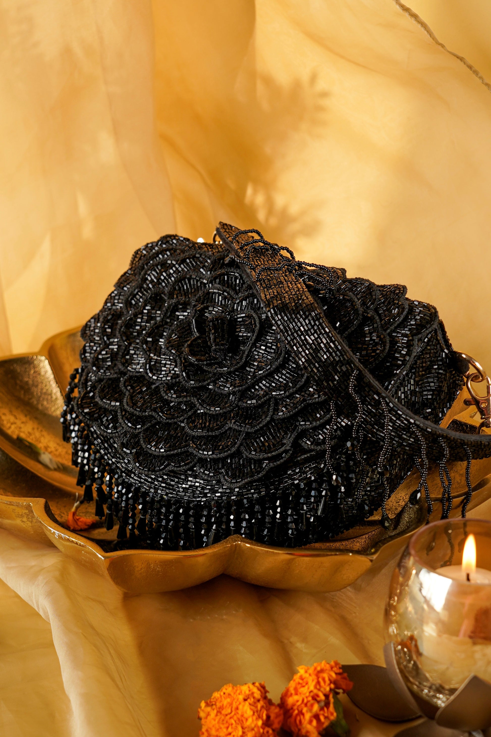 This handcrafted black clutch features intricate floral beadwork in a raised motif that radiates bold elegance. Designed to elevate any evening ensemble, it’s the perfect companion for cocktail nights, festive gatherings, or wedding receptions with a dash of drama.