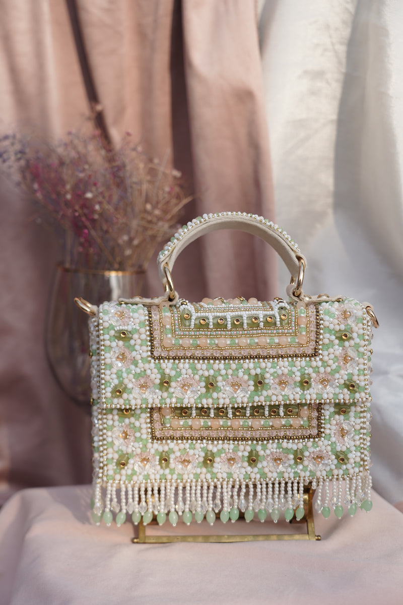Hand-embroidered with soft pastel beads, mirrors, and delicate fringe, this structured top-handle bag is like a garden party in accessory form. Feminine, fresh, and rich in texture, it’s perfect for spring weddings, day functions, or anyone who loves playful luxury.