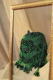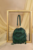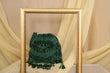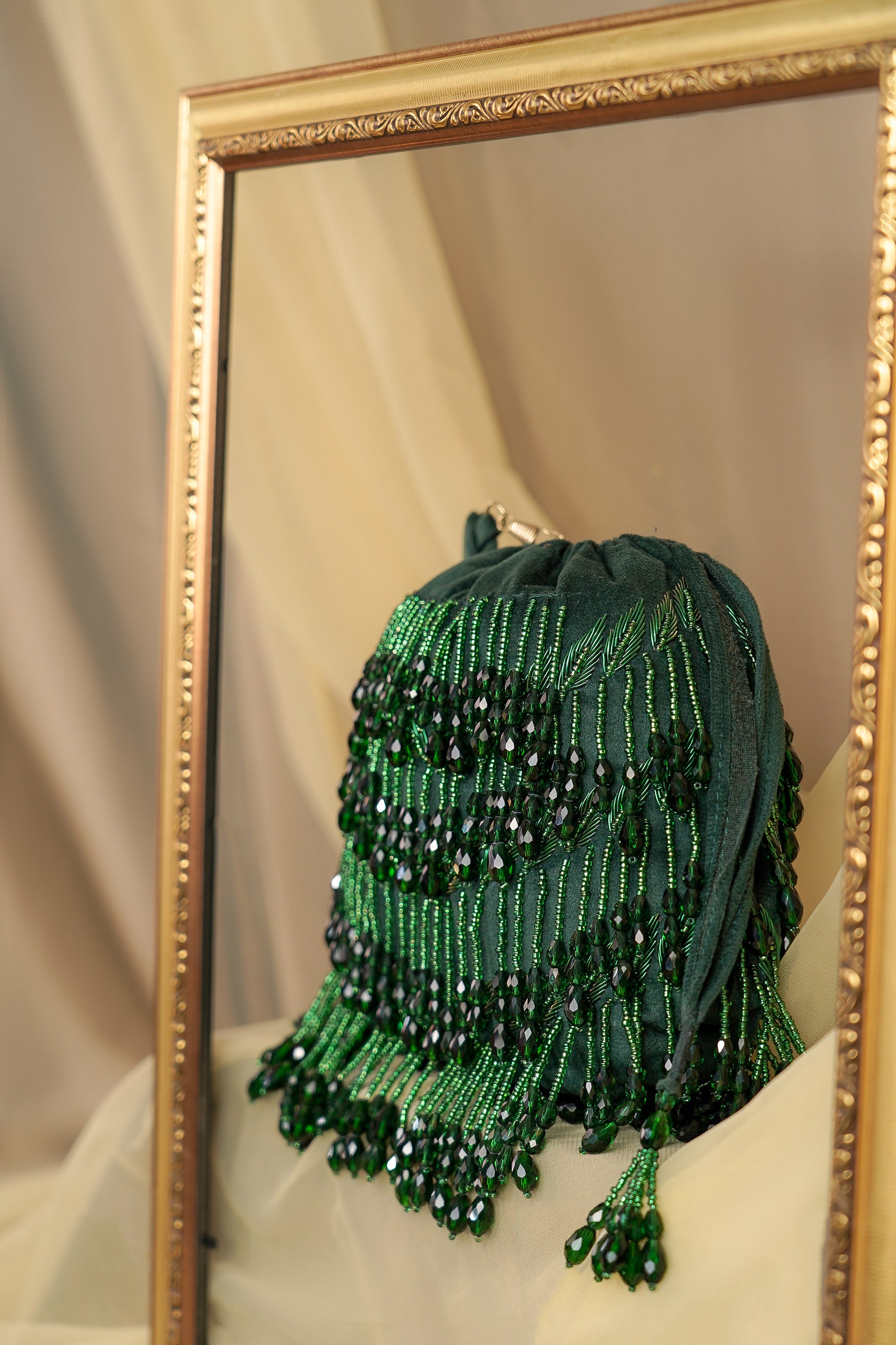 “A luxurious green velvet potli bag adorned with intricate beadwork and shimmering tassels, perfect for adding a regal touch to your festive or bridal ensemble.”