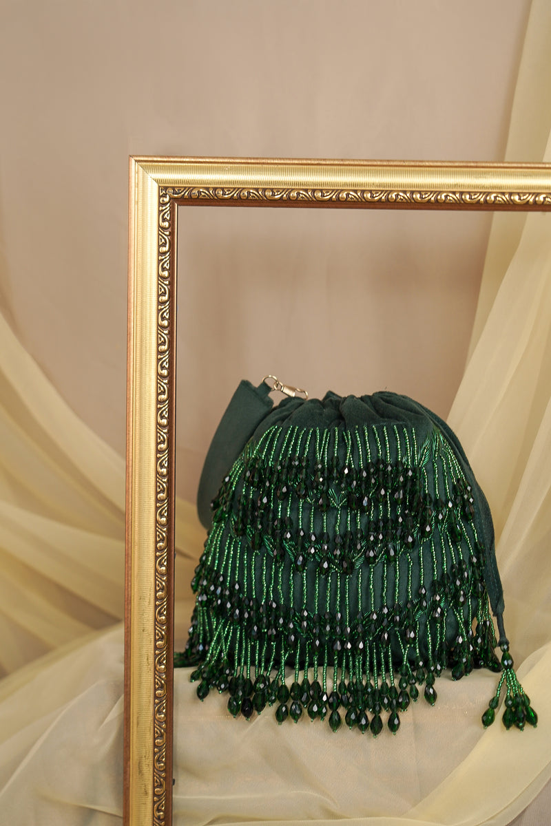 A luxurious green velvet potli bag adorned with intricate beadwork and shimmering tassels, perfect for adding a regal touch to your festive or bridal ensemble.