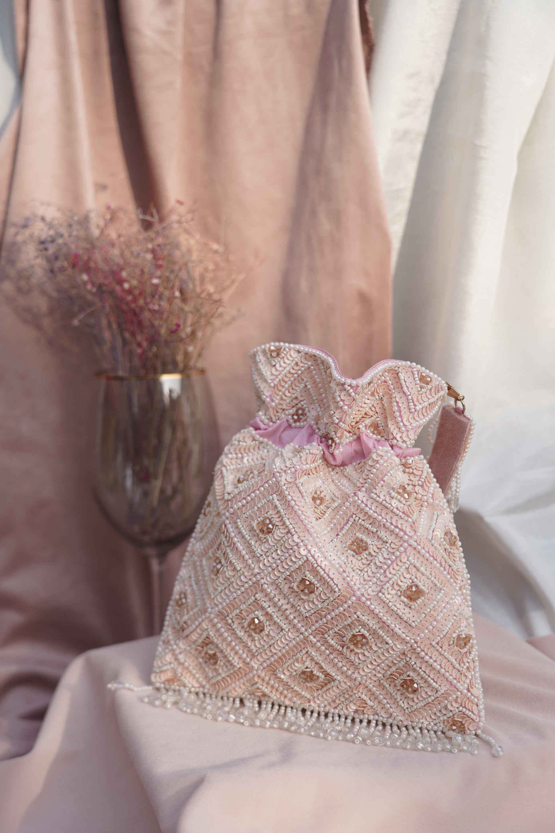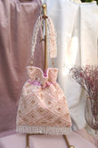 This soft blush potli features intricate geometric embroidery, shimmering sequin accents, and a beautiful tasseled fringe. Designed with a beaded handle and ruched drawstring, it’s the perfect pick for bridal festivities, haldi celebrations, or pastel-themed events.