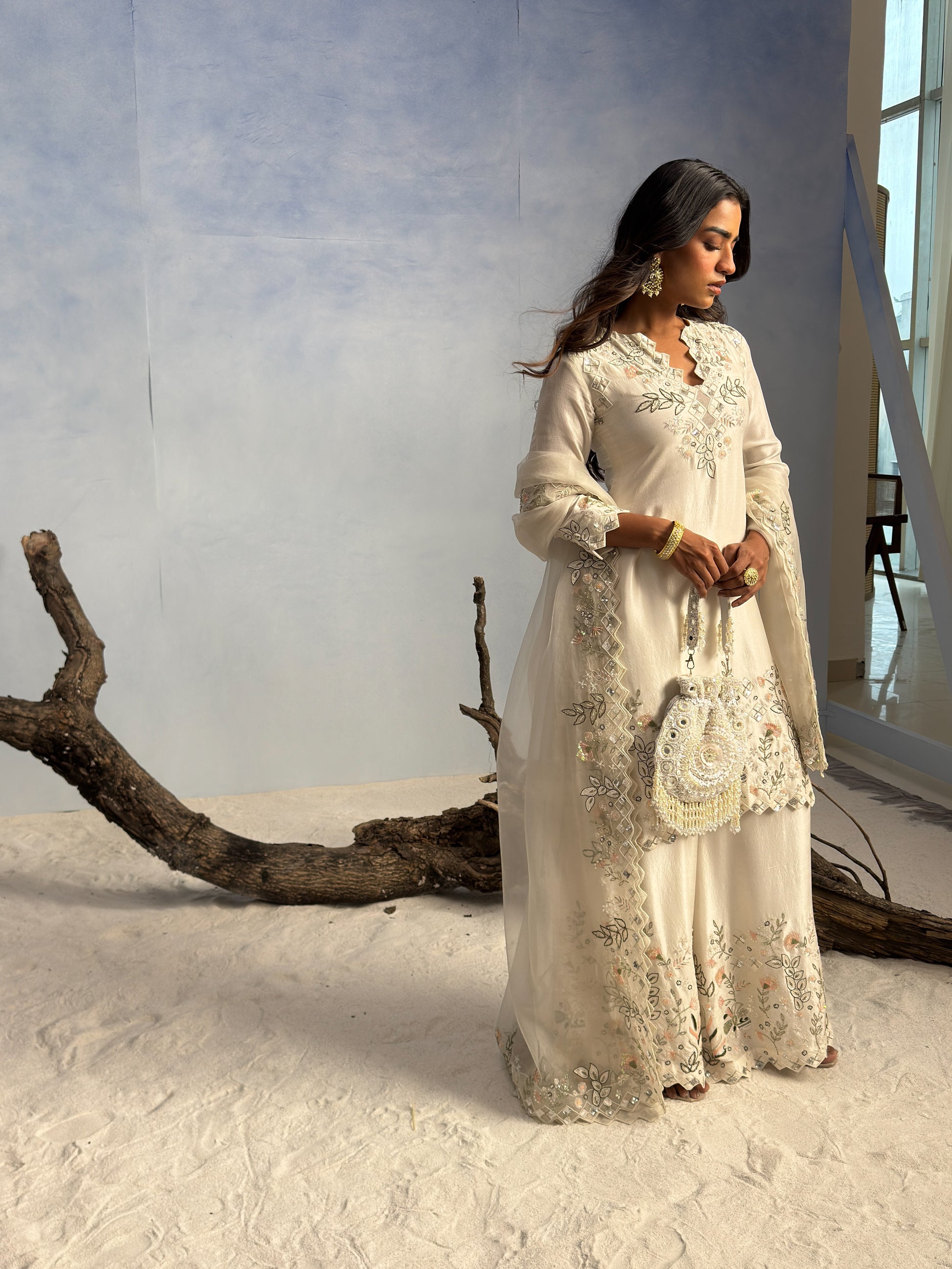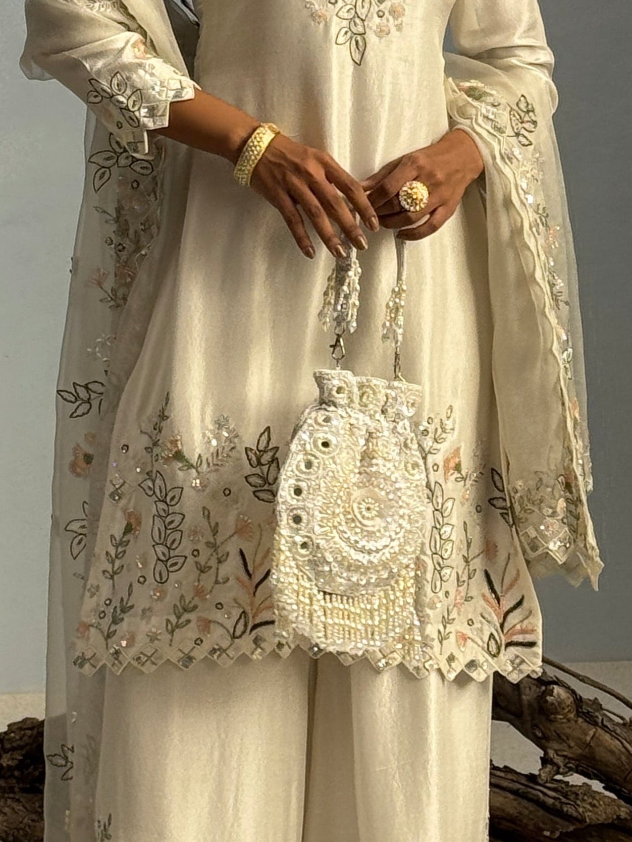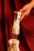 Noor E Gulzar Potli is a luxurious white suede bag adorned with delicate pearls and shimmering sequins, creating an elegant and festive look. Lightweight and versatile, this designer potli complements lehengas, sarees, anarkalis, and Indo-western outfits perfectly. Ideal for weddings, sangeet, festive occasions, and other celebrations, it adds a touch of sophistication to every ensemble.